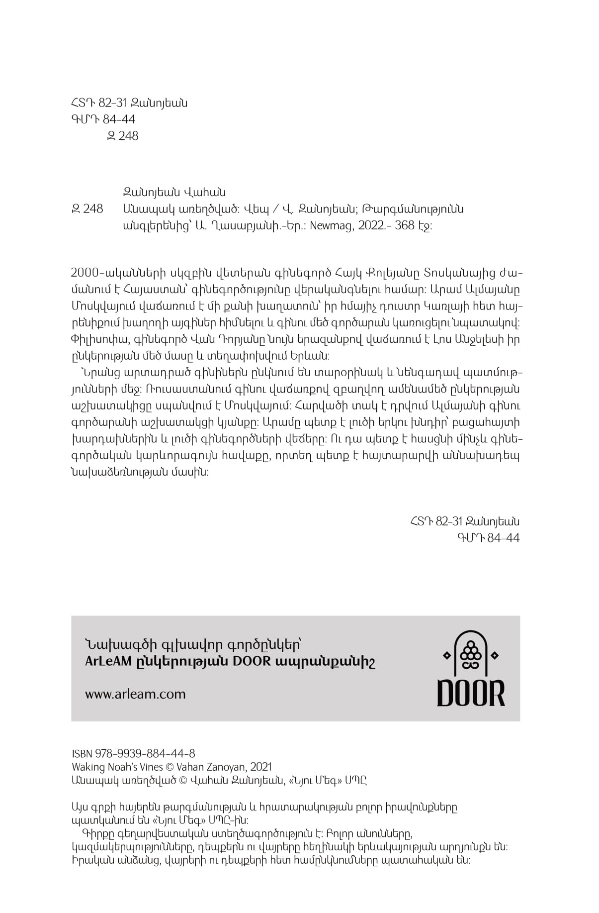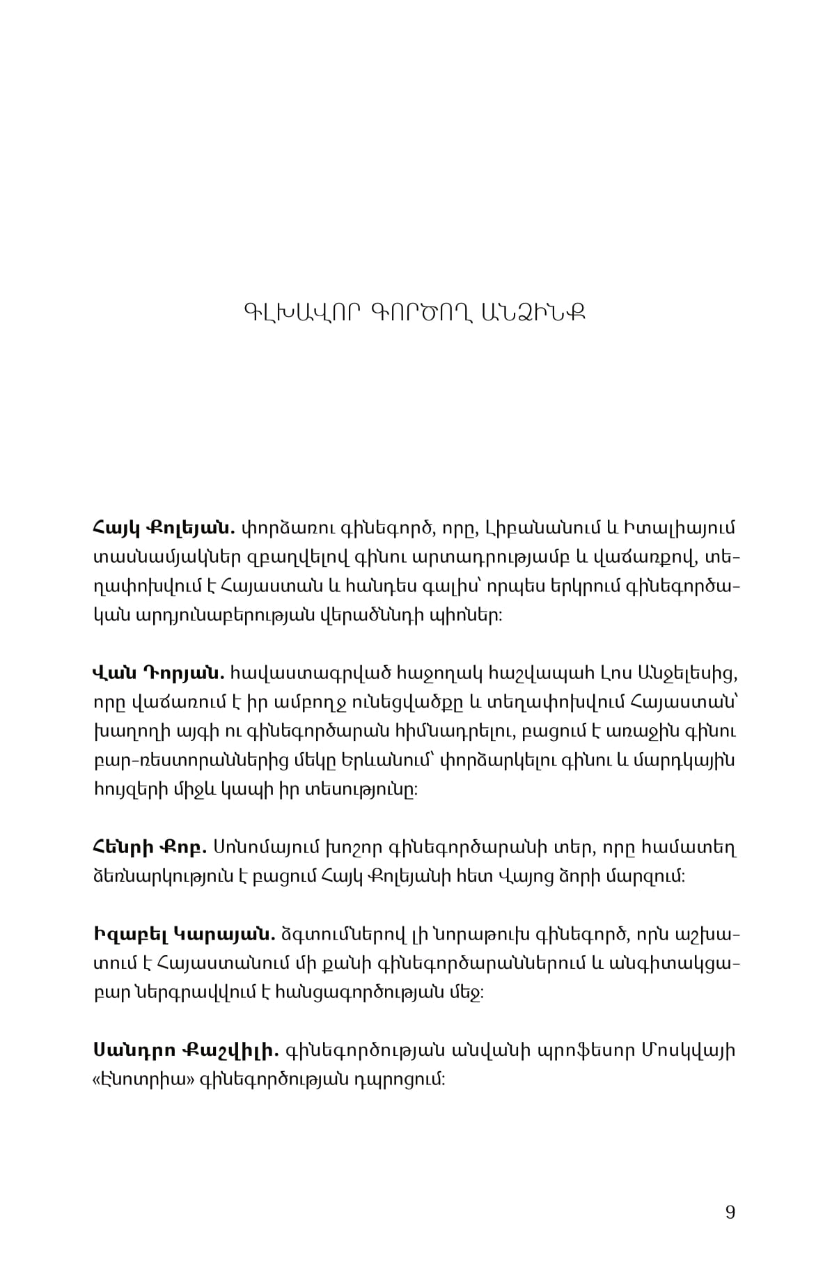 2000-ականների սկզբին վետերան գինեգործ Հայկ Քոլեյանը Տոսկանայից ժամանում է Հայաստան՝ գինեգործությունը վերականգնելու համար։ Արամ Ալմայանը Մոսկվայում վաճառում է մի քանի խաղատուն՝ իր հմայիչ դուստր Կառլայի հետ հայրենիքում խաղողի այգիներ հիմնելու եւ գինու մեծ գործարան կառուցելու նպատակով։ Փիլիսոփա, գինեգործ Վան Դորյանը նույն երազանքով
