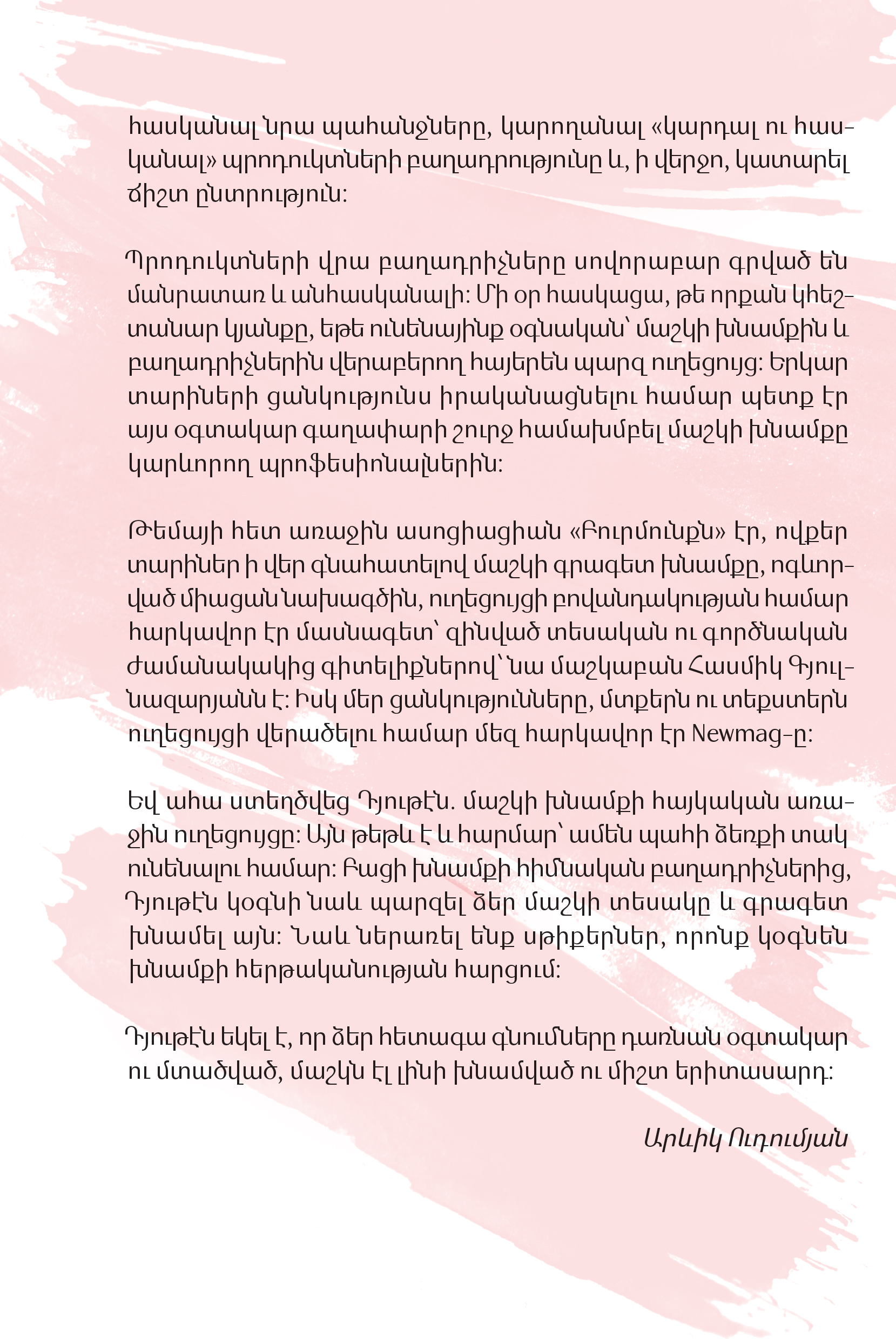 Newmag-ն Արևիկ Ուդումյանն ու «Բուրմունքը» ներկայացնում են մաշկի խնամքի հայկական առաջին ուղեցույց-ամսագիրը: «Դյութէն» եկել է, որ Ձեր հետագա գնումները դառնան օգտակար ու մտածված, մաշկն էլ լինի խնամված ու միշտ երիտասարդ։