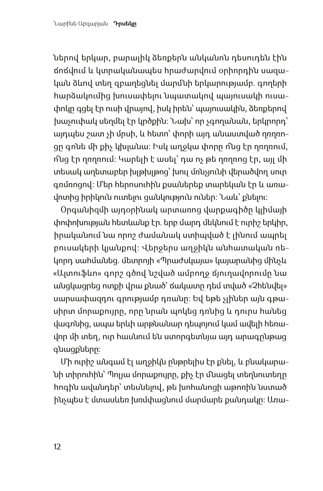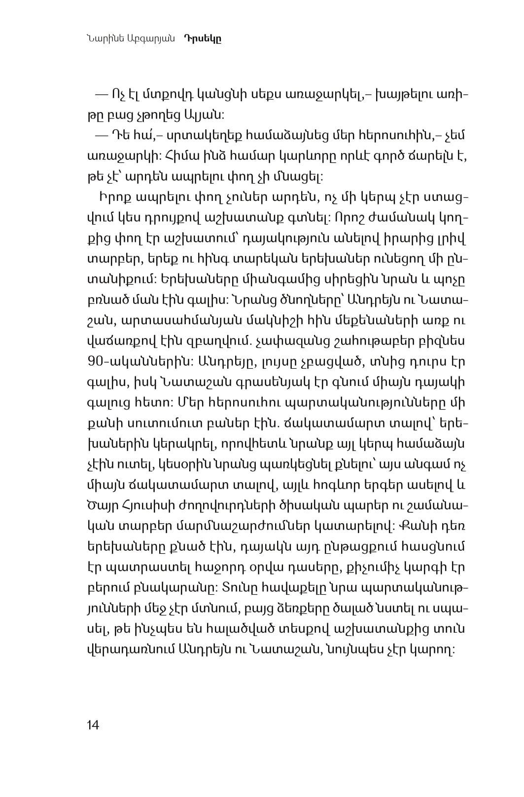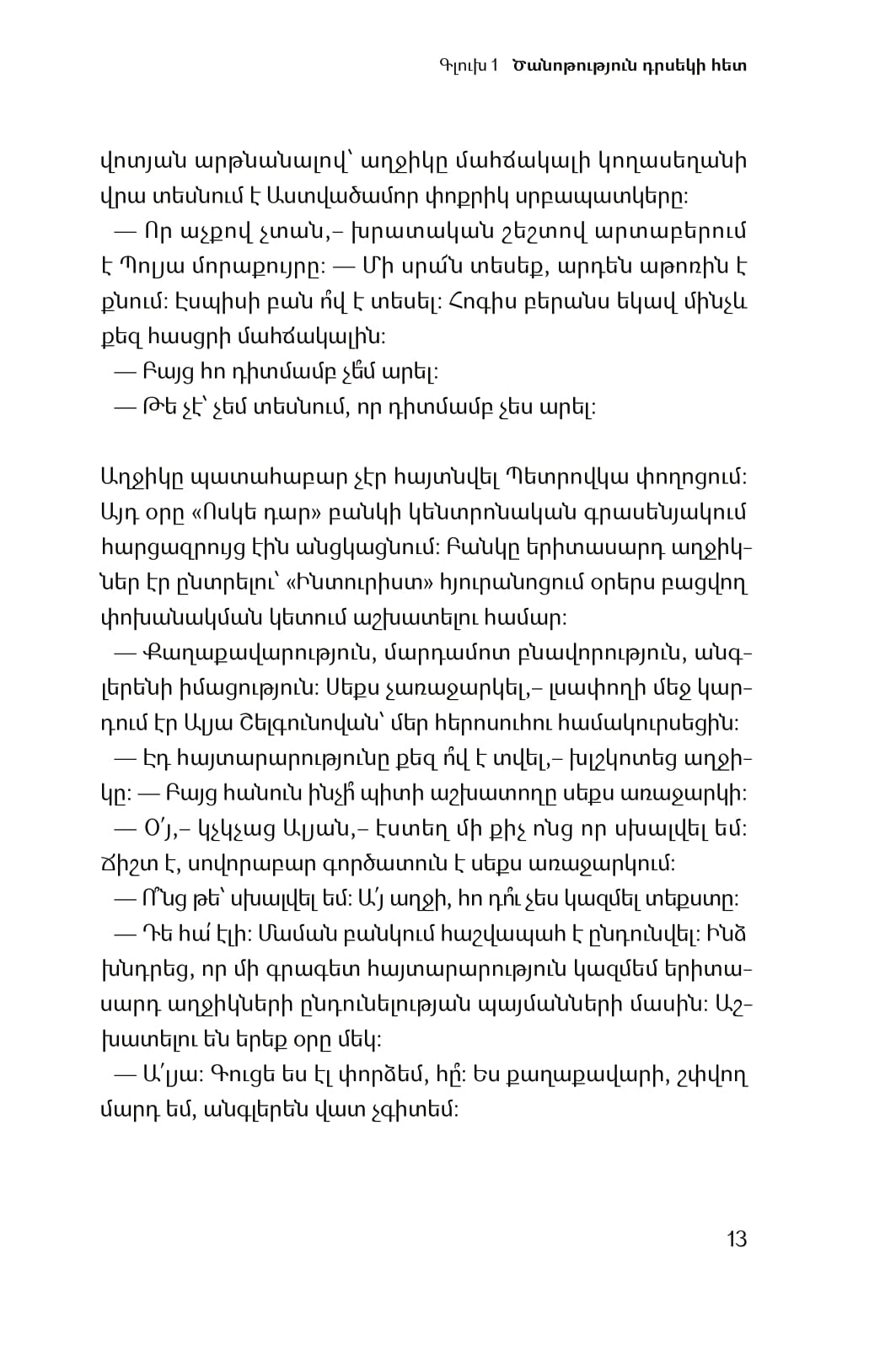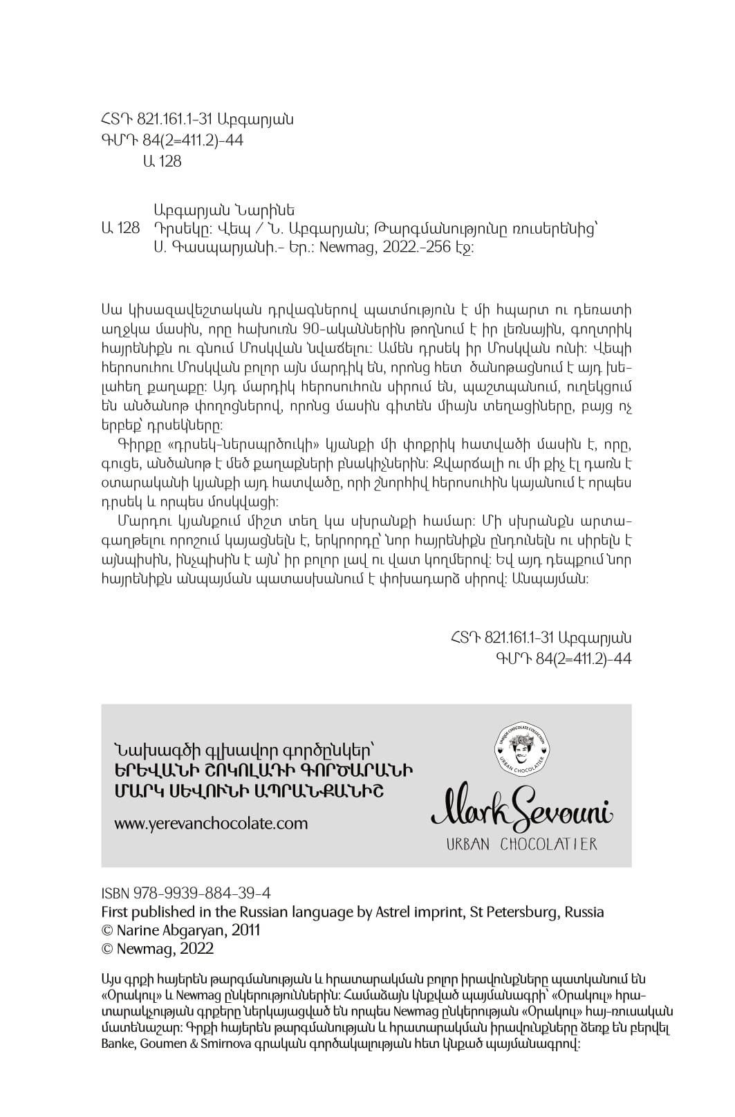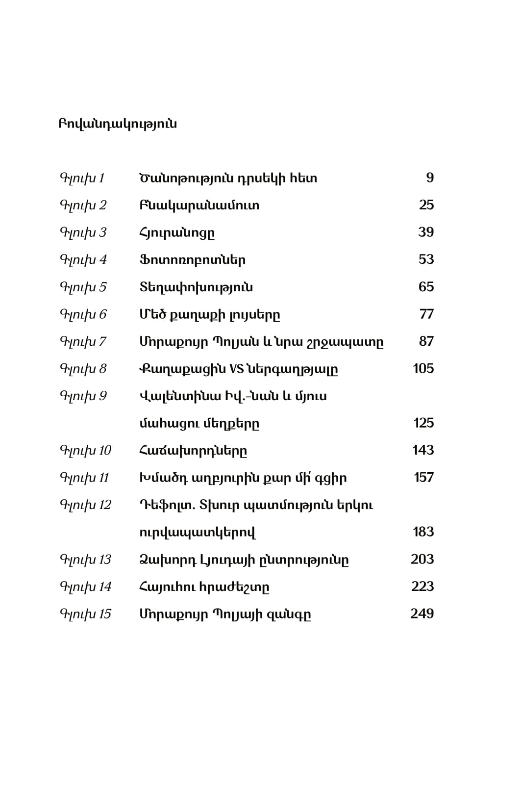 Գիրքը «դրսեկ-ներսպրծուկի» կյանքի մի փոքրիկ հատվածի մասին է, որը, գուցե, անծանոթ է մեծ քաղաքների բնակիչներին: Զվարճալի ու մի քիչ էլ դառն է օտարականի կյանքի այդ հատվածը, որի շնորհիվ հերոսուհին կայանում է որպես դրսեկ և որպես մոսկվացի: