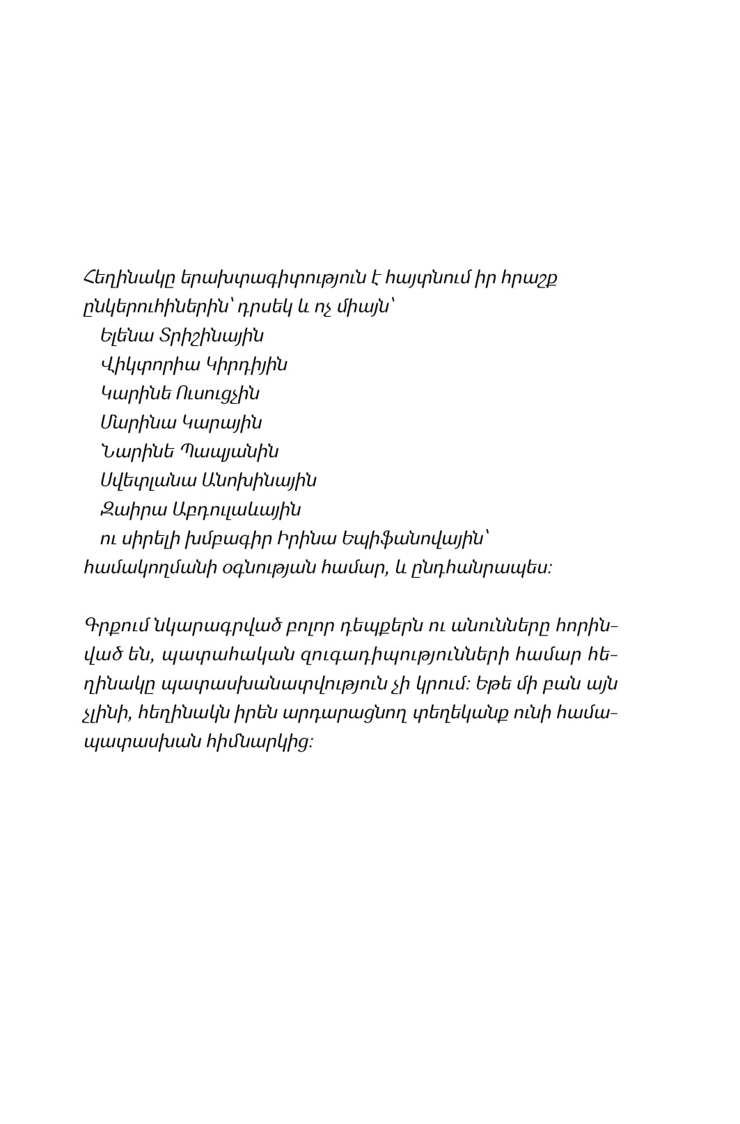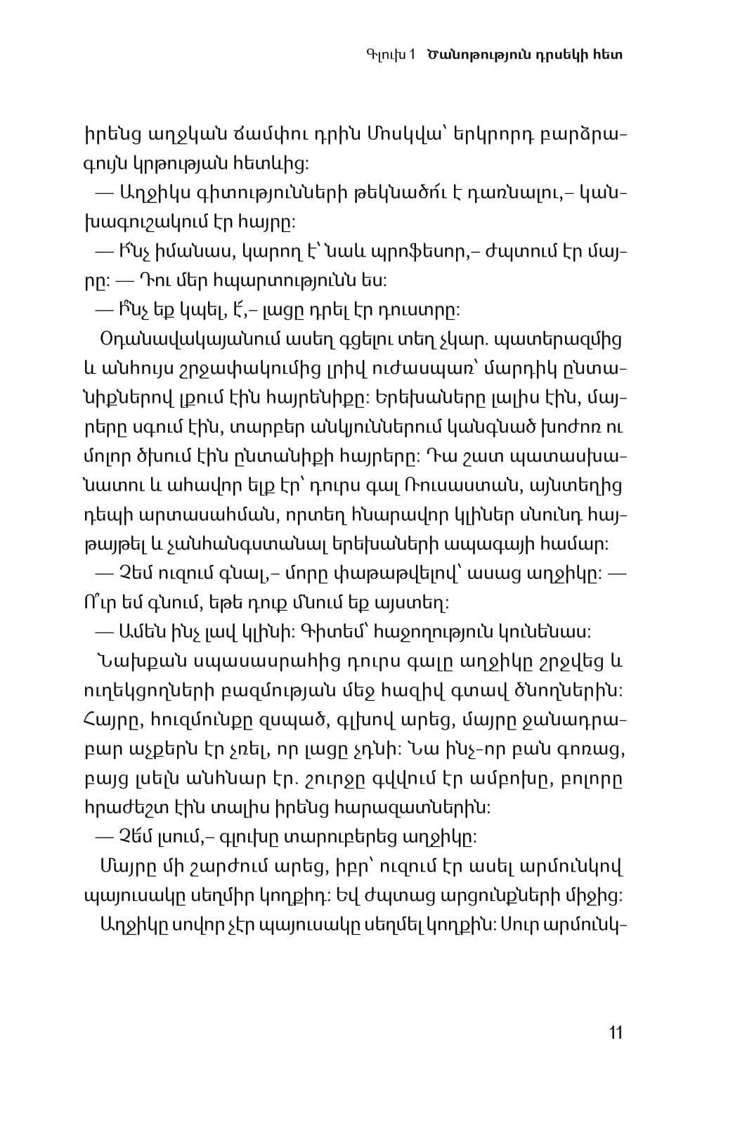 Մարդու կյանքում միշտ տեղ կա սխրանքի համար: Մի սխրանքը արտագաղթելու որոշում կայացնելն է, երկրորդը՝ նոր հայրենիքն ընդունելն ու սիրելն է այնպիսին, ինչպիսին է այն՝ իր բոլոր լավ ու վատ կողմերով: Եվ այդ դեպքում նոր հայրենիքն անպայման պատասխանում է փոխադարձ սիրով: Անպայման: