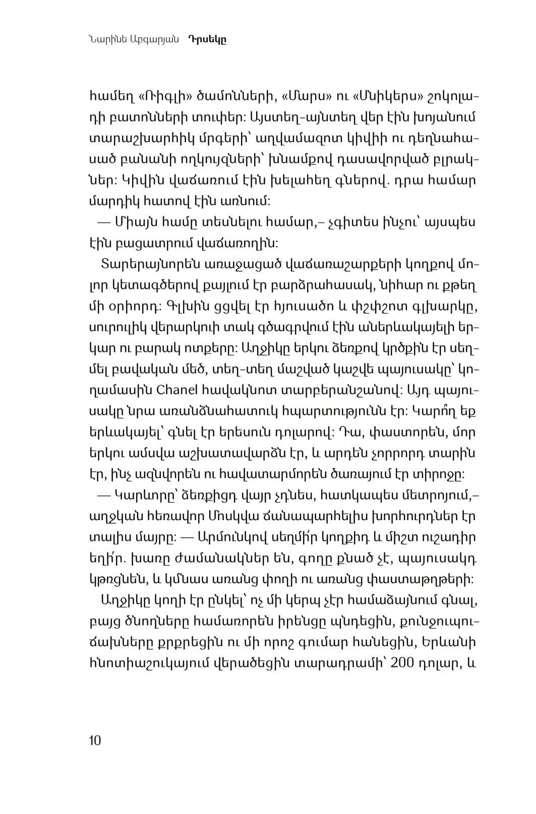 Սա կիսազավեշտական դրվագներով պատմություն է մի հպարտ ու դեռատի աղջկա մասին, որը հախուռն 90-ականներին թողնում է իր լեռնային, գողտրիկ հայրենիքն ու գնում՝ Մոսկվան նվաճելու: Ամեն դրսեկ իր Մոսկվան ունի: Վեպի հերոսուհու Մոսկվան բոլոր այն մարդիկ են, որոնց հետ ծանոթացնում է այդ խելահեղ քաղաքը: Այդ մարդիկ հերոսուհուն սիրում են, պաշտպանում, ուղեկցում են անծանոթ փողոցներով, որոնց մասին գիտեն միայն տեղացիները, բայց ոչ երբեք՝ դրսեկները: