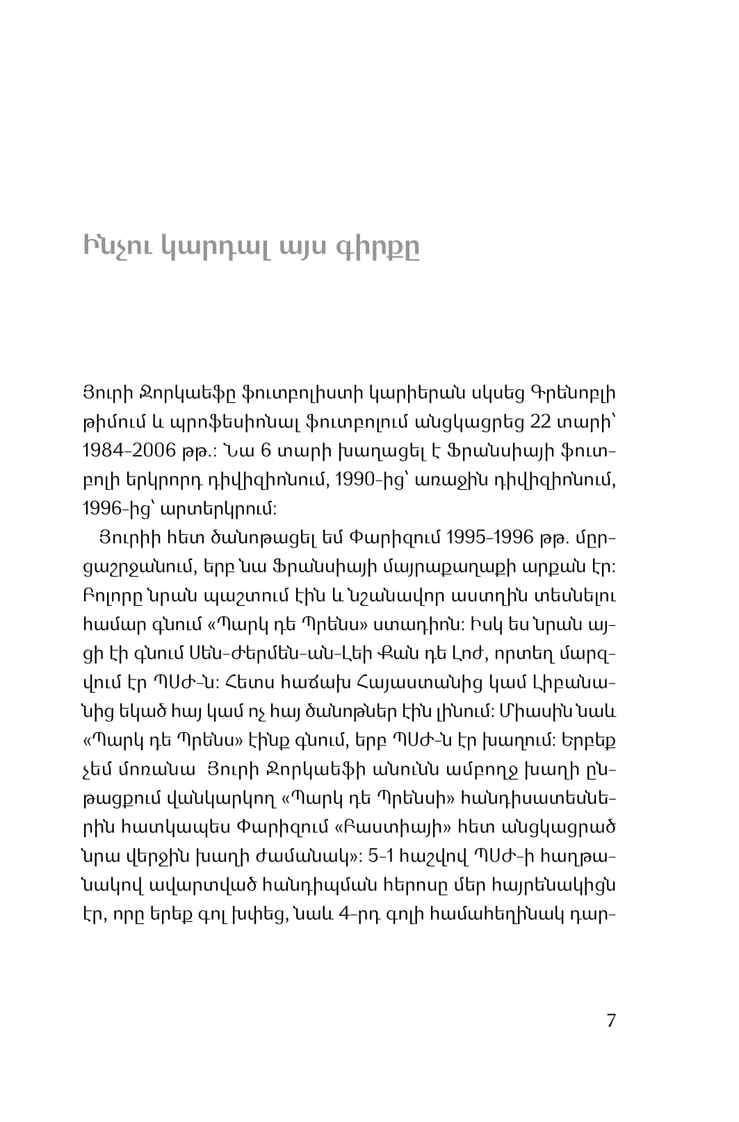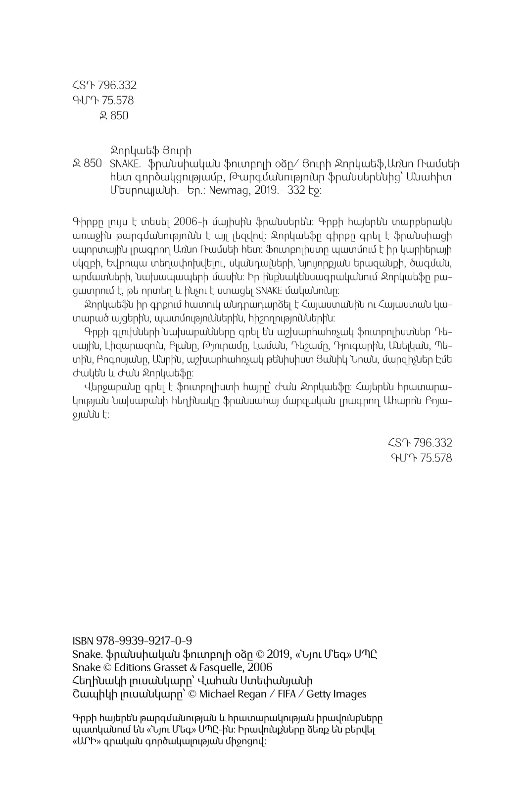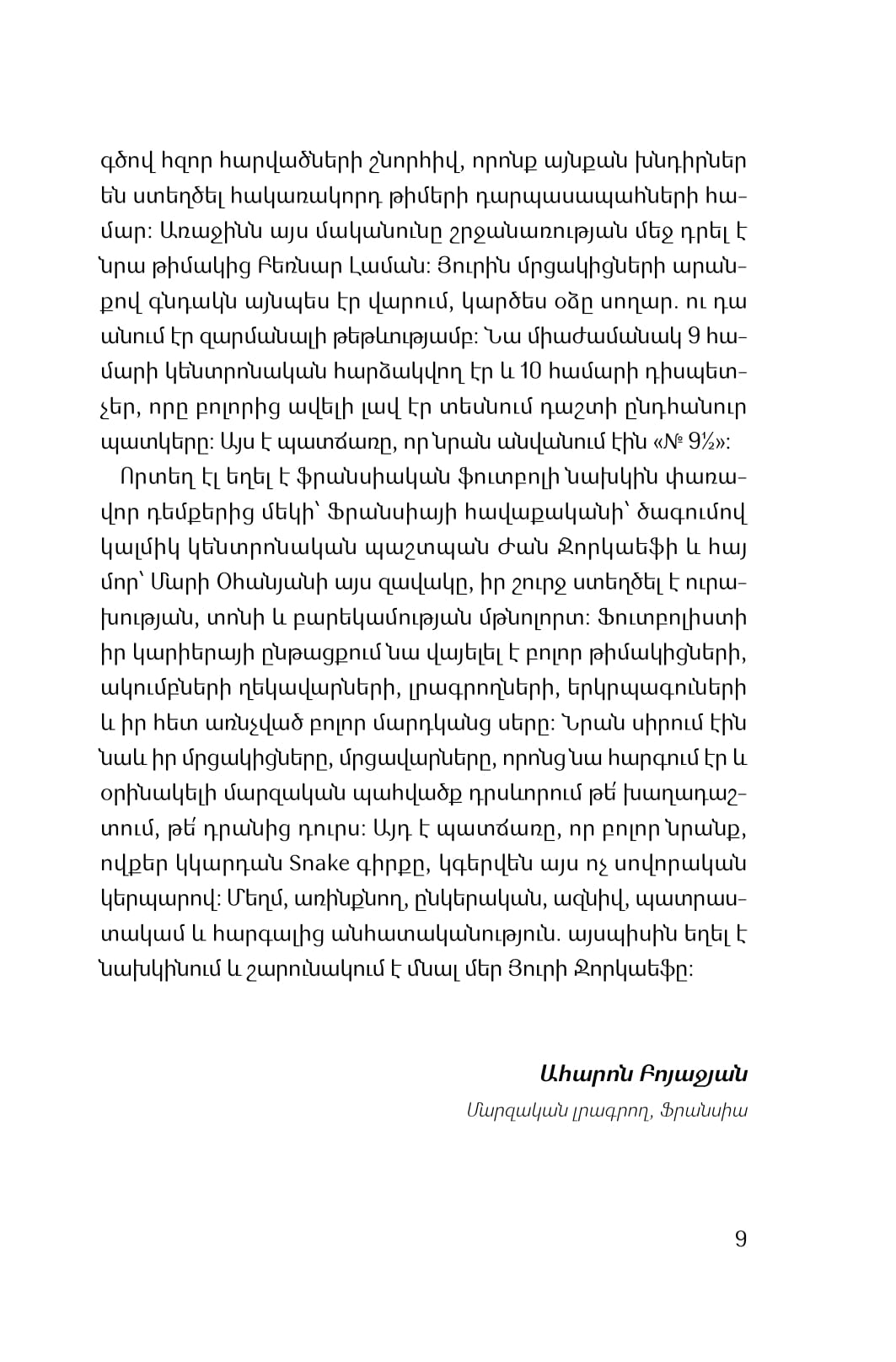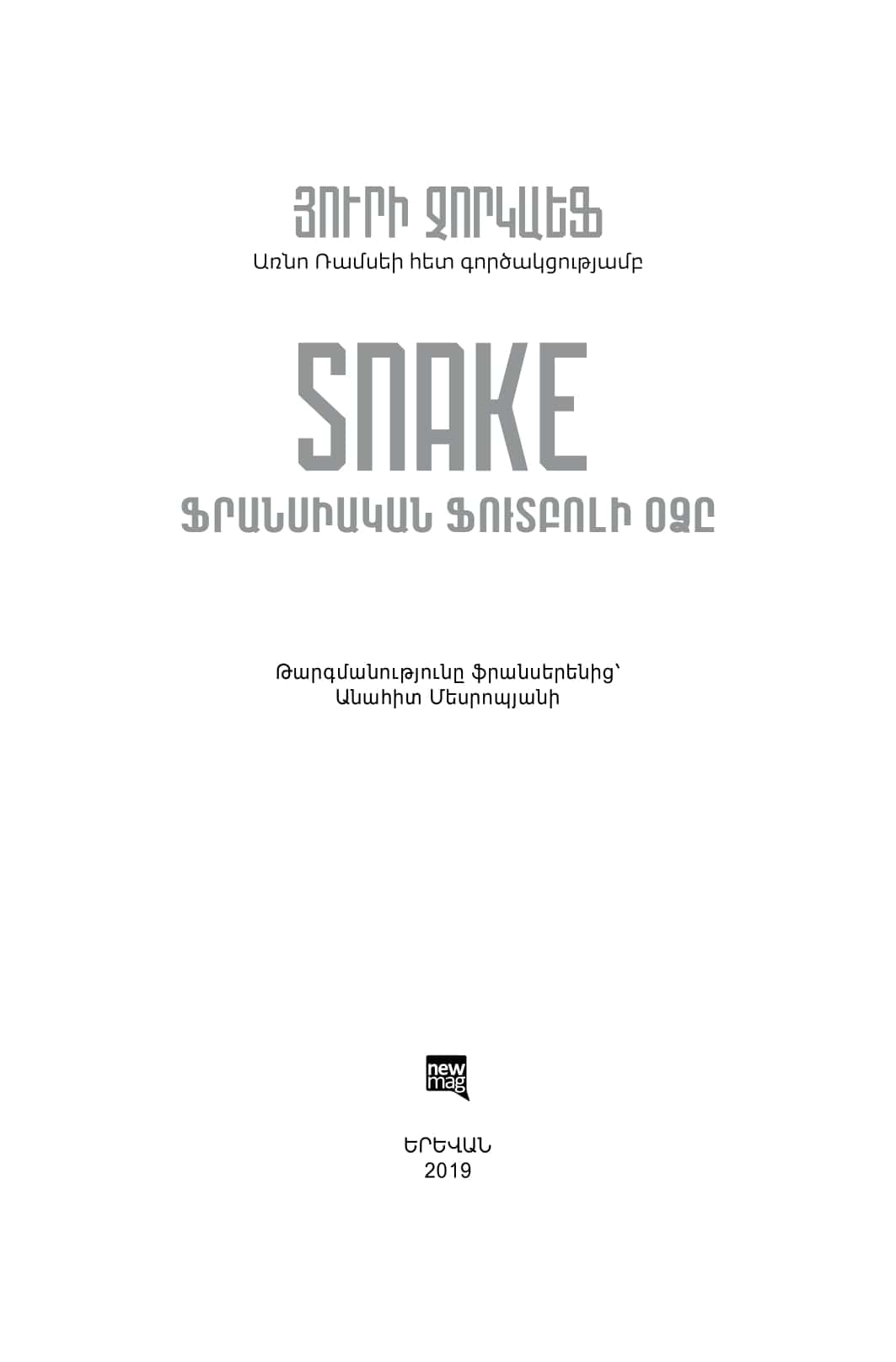 Գիրքը լույս է տեսել 2006-ի մայիսին ֆրանսերեն: Գրքի հայերեն տարբերակն առաջին թարգմանությունն է այլ լեզվով: Ջորկաեֆը գիրքը գրել է ֆրանսիացի սպորտային լրագրող Առնո Ռամսեի հետ: Ֆուտբոլիստը պատմում է իր կարիերայի սկզբի, Եվրոպա տեղափոխվելու, սկանդալների, նյույորքյան երազանքի, ծագման, արմատների, նախապապերի մասին: Իր ինքնակենսագրականում Ջորկաեֆը բացատրում է, թե որտեղ և ինչու է ստացել SNAKE մականունը: Ջորկաեֆն իր գրքում հատուկ անդրադարձել է Հայաստանին ու Հայաստան կատարած այցերին, պատմություններին, հիշողություններին: Գրքի գլուխների նախաբանները գրել են աշխարհահռչակ ֆուտբոլիստներ Դեսային, Լիզարազուն, Բլանը, Թյուրամը, Լաման, Դեշամը, Դյուգարին, Անելկան, Պետին, Բոգոսյանը, Անրին, աշխարհահռչակ թենիսիստ Յանիկ Նոան, մարզիչներ Էմե Ժակեն և Ժան Ջորկաեֆը: Վերջաբանը գրել է ֆուտբոլիստի հայրը՝ Ժան Ջորկաեֆը: Հայերեն հրատարակության նախաբանի հեղինակը ֆրանսահայ մարզական լրագրող Ահարոն Բոյաջյանն է։