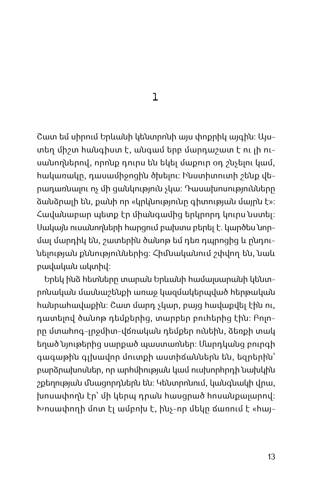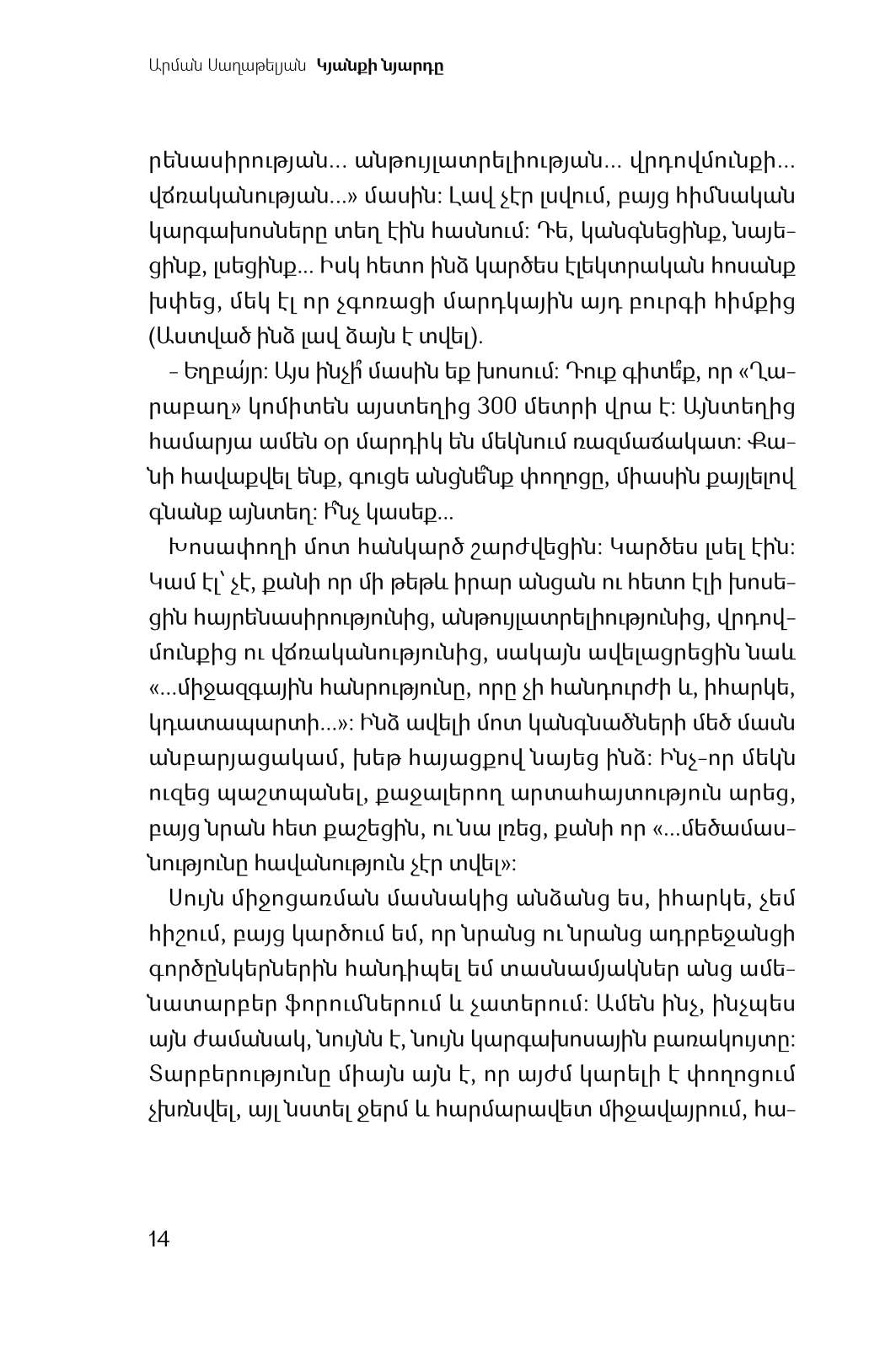 Ինչո՞վ էր զբաղված և ինչ էր մտածում հայ երիտասարդը 1990-ականներին, ԽՍՀՄ փլուզման, անկախացման, արցախյան գոյամարտի և էներգետիկ ճգնաժամի տարիներին: Զգու՞մ էր պատմական փոփոխությունների անդառնալիությունը, որի ականատեսն էր ավագ սերունդը: Եվ ի՞նչ էր նշանակում լինել 17-ամյա անհոգ պատանի երկրի համար ամենաբարդ ժամանակներում: Արման Սաղաթելյանի ինքնակենսագրական վեպը ներկայացնում է 1991-93 թվականների Հայաստանը: Այն սև ու սպիտակ չէ , ոչ միայն հաղթական գոյամարտի մասին է, այլև ցրտի և մթի: Ամեն ինչ ոչ շատ վատ էր, ոչ էլ լավ: Հեղինակի ձևակերպմամբ՝ տանելի էր: