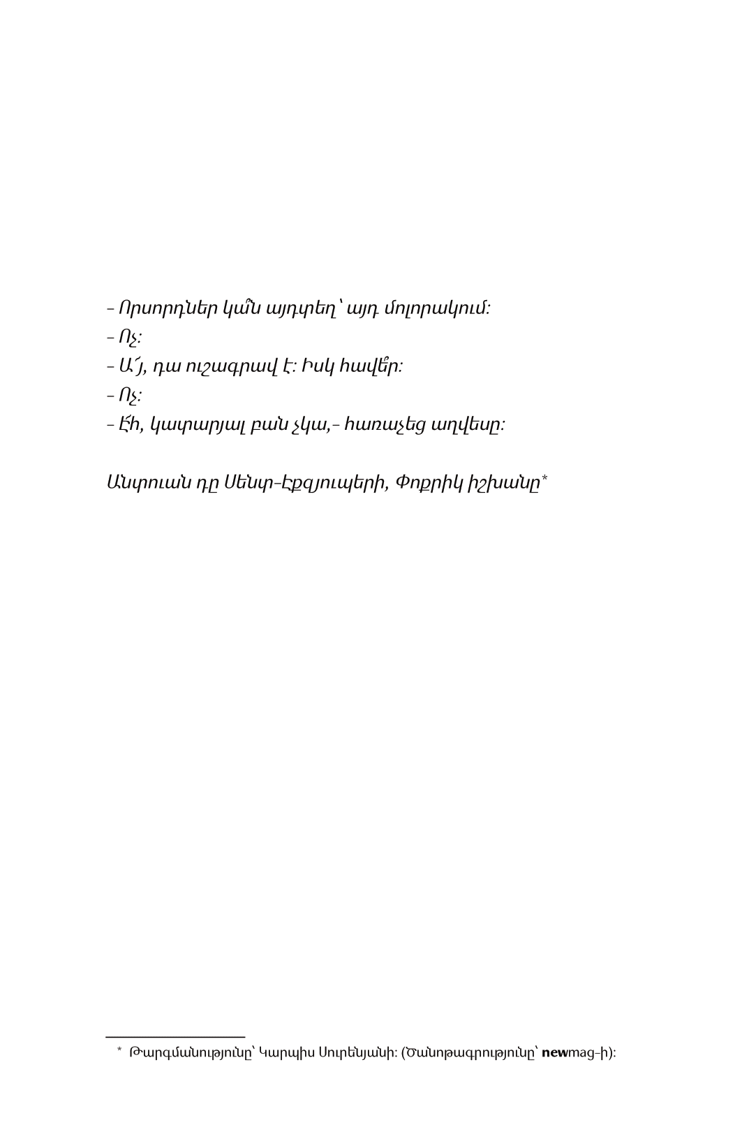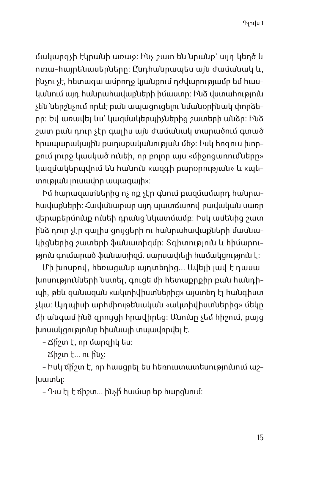 Այս գիրքը ռազմաճակատում հայտնված երկու երիտասարդի մասին է: Նրանք ծնողներից թաքուն մեկնում են Արցախ և մասնակցում Չլդրանի համար մղվող մարտերին: Արցախյան պատերազմը նկարագրված է ականատեսի աչքերով. ոչինչ չափազանցված չէ՝ ո՛չ վախը, ո՛չ համարձակությունը, ո՛չ մահը, ո՛չ էլ պայքարը: Չլդրանի համար մղված մարտը բախտորոշ է եղել, քանի որ դարձել է պատերազմի ամբողջ ընթացքի բեկումնային պահերից մեկը: 1993-ի փետրվարի 5-ին Չլդրանի ազատագրմանը հաջորդել են հայկական ուժերի գարնանային լայնածավալ հակահարձակումը և Մարտակերտի շրջանի ամբողջական ազատագրումը: