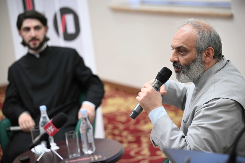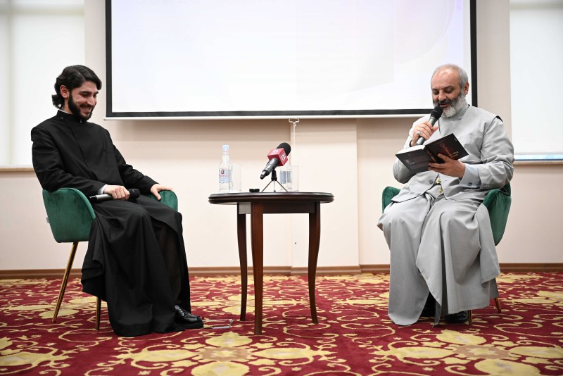 Շնորհանդեսը շարունակվեց զրույցի ձևաչափով, որն անցկացրեց աստվածաբան, բլոգեր Թովմաս Առաքելյանը, ով ընդգծեց, որ գիրքը նախարժեհամակարգ ձևավորելու մասին է։ Աստվածաբանի այն հարցին, թե ինչպես պետք է արժեքները դարձնել համակարգ, Սրբազանը պատասխանեց, որ արժեքները թելադրում է պետությունը.