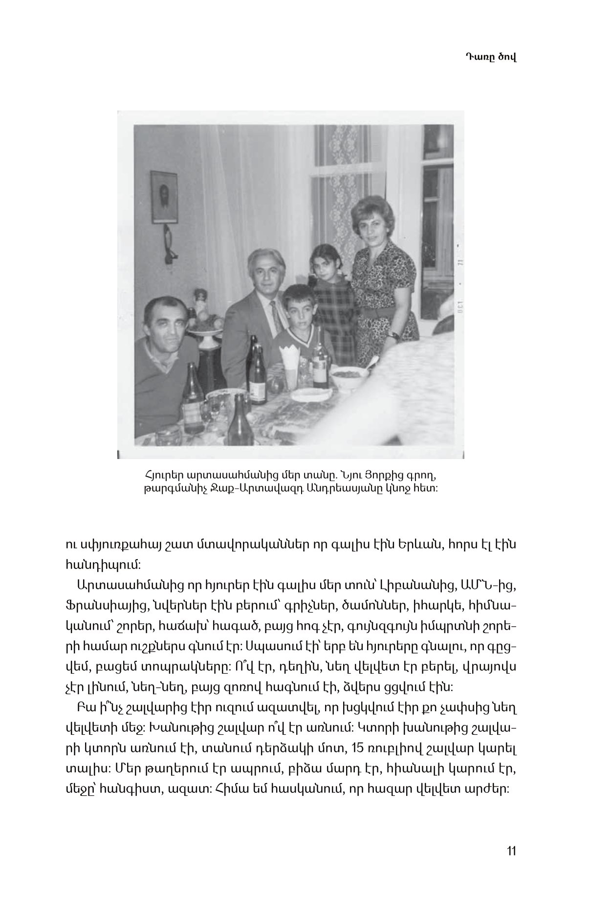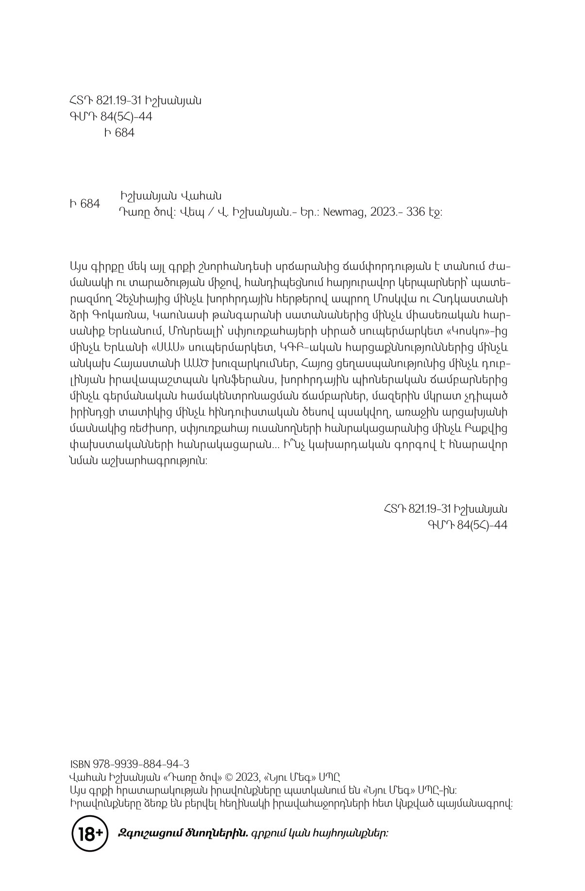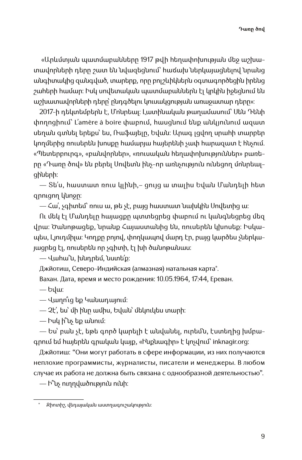 This book takes from the presentation of another book on a journey through time and space, meets hundreds of characters: from the warring Chechnya to Soviet Moscow and free Gokarna of India, from the devils of the Kaunas Museum to a homosexual wedding in Yerevan, from the Kosko supermarket beloved by Armenians of the Diaspora in Montreal to the Yerevan supermarket "SAS", from the interrogations of the KGB before the searches in the National Security Service of independent Armenia, from the Armenian Genocide to the Dublin Human Rights Conference, from Soviet pioneer camps to German concentration camps, the scissors did not touch the hair from the grandmother from Irind to the director-participant of the first Artsakhyan, who was crowned with a Hindu ceremony, from the hostel of Armenian students of the diaspora to the hostel of refugees from Baku... With what magic carpet is such geography possible?