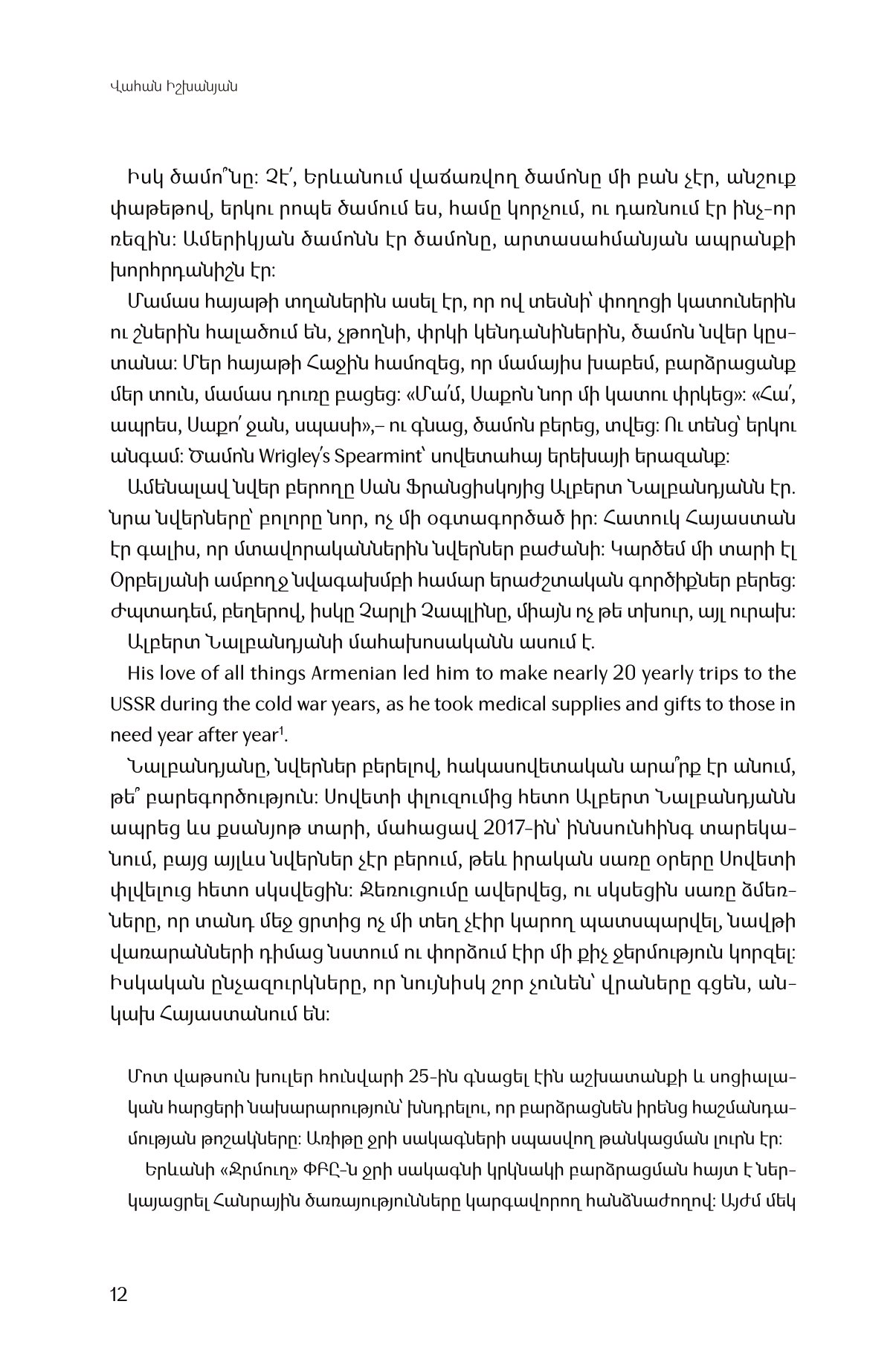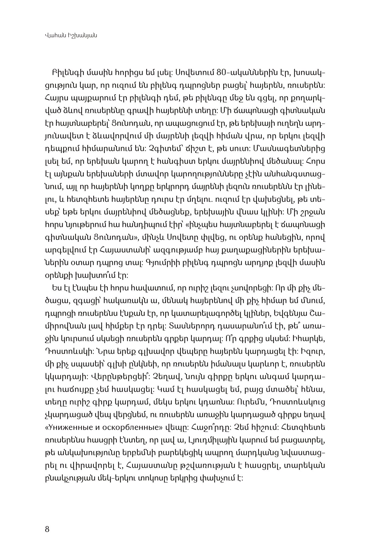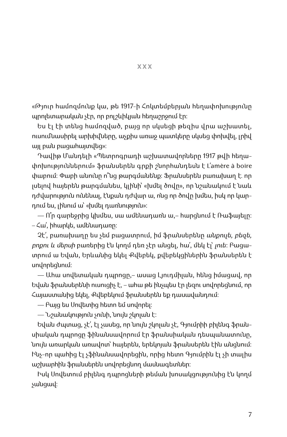 This book takes from the presentation of another book on a journey through time and space, meets hundreds of characters: from the warring Chechnya to Soviet Moscow and free Gokarna of India, from the devils of the Kaunas Museum to a homosexual wedding in Yerevan, from the Kosko supermarket beloved by Armenians of the Diaspora in Montreal to the Yerevan supermarket "SAS", from the interrogations of the KGB before the searches in the National Security Service of independent Armenia, from the Armenian Genocide to the Dublin Human Rights Conference, from Soviet pioneer camps to German concentration camps, the scissors did not touch the hair from the grandmother from Irind to the director-participant of the first Artsakhyan, who was crowned with a Hindu ceremony, from the hostel of Armenian students of the diaspora to the hostel of refugees from Baku... With what magic carpet is such geography possible?