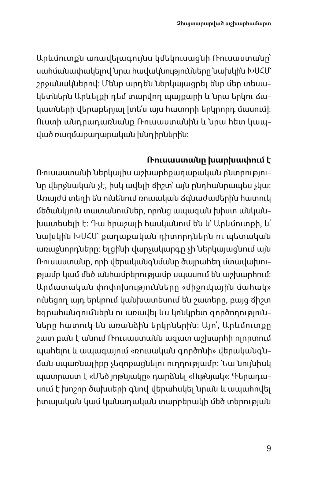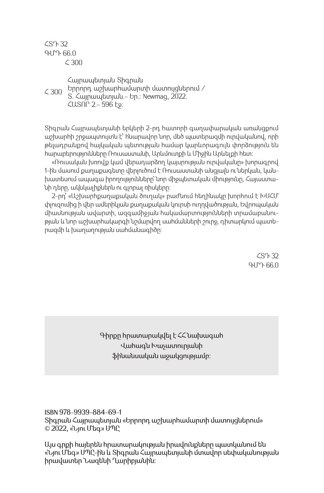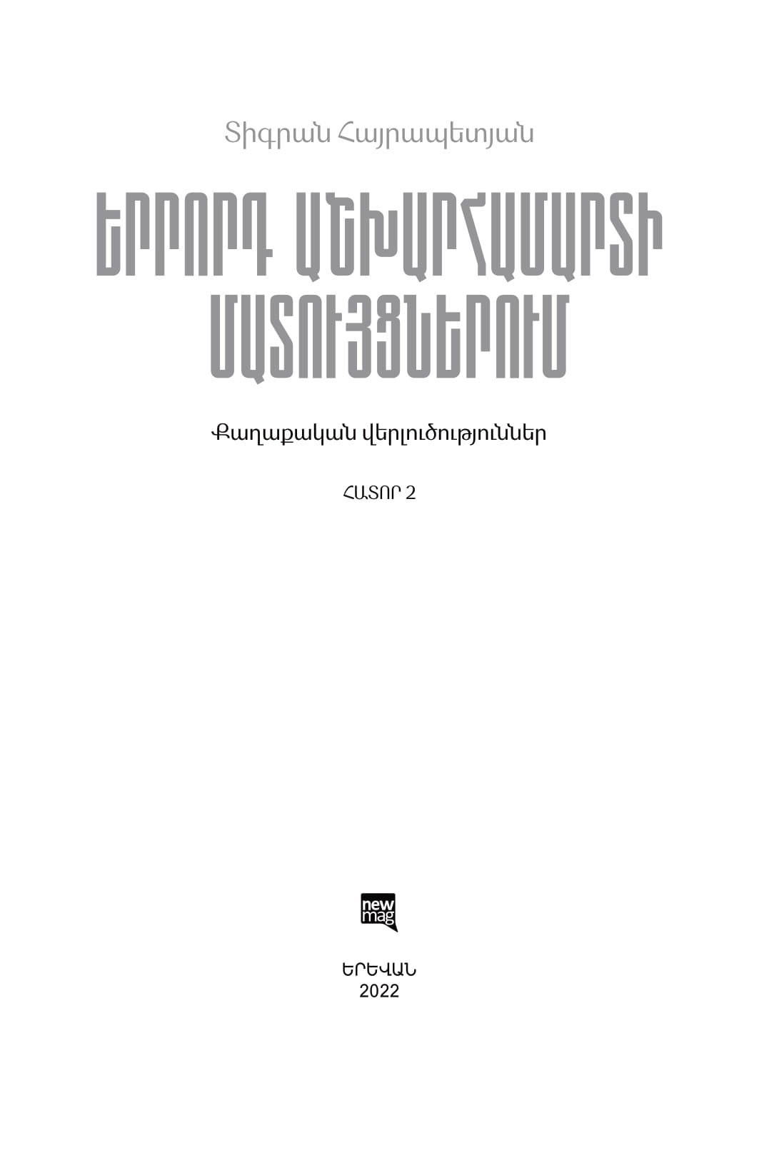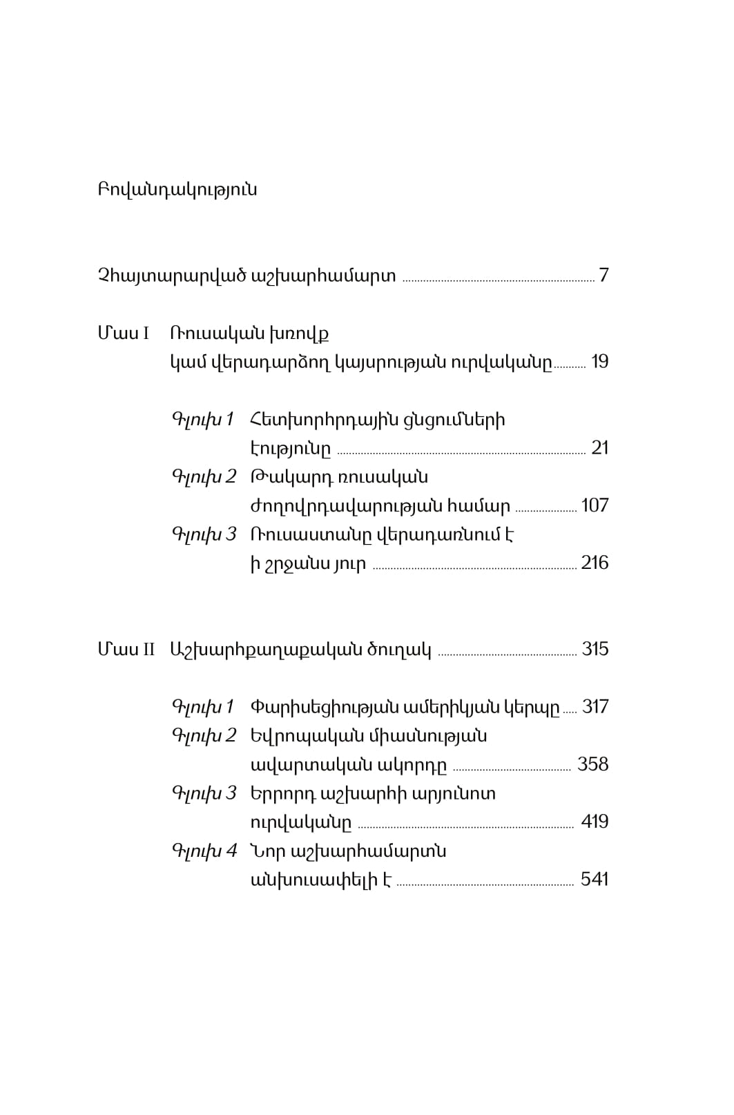 The ideological core of the 2nd volume of Tigran Hayrapetyan's works is the revolution of the world with the specter of a possible new, great war. Tigran wrote about Russia, the West and the Middle East which are the most important test for the Armenian state. In the 1st part called "Russian Rebellion or the Ghost of the Returning Empire", the political scientist analyzes Russia's past and present, predicts future realities: the new interstate union, the role of Armenia, expectations and global risks. In the 2nd part called "The Geopolitical Trap", the author reflects on the direction of the American political course since the collapse of the USSR, the end of European unity, the logic of inter-ethnic conflicts and the marked boundaries of the new world order, the borderline between war and peace.