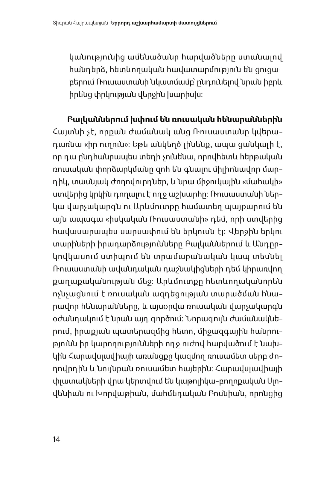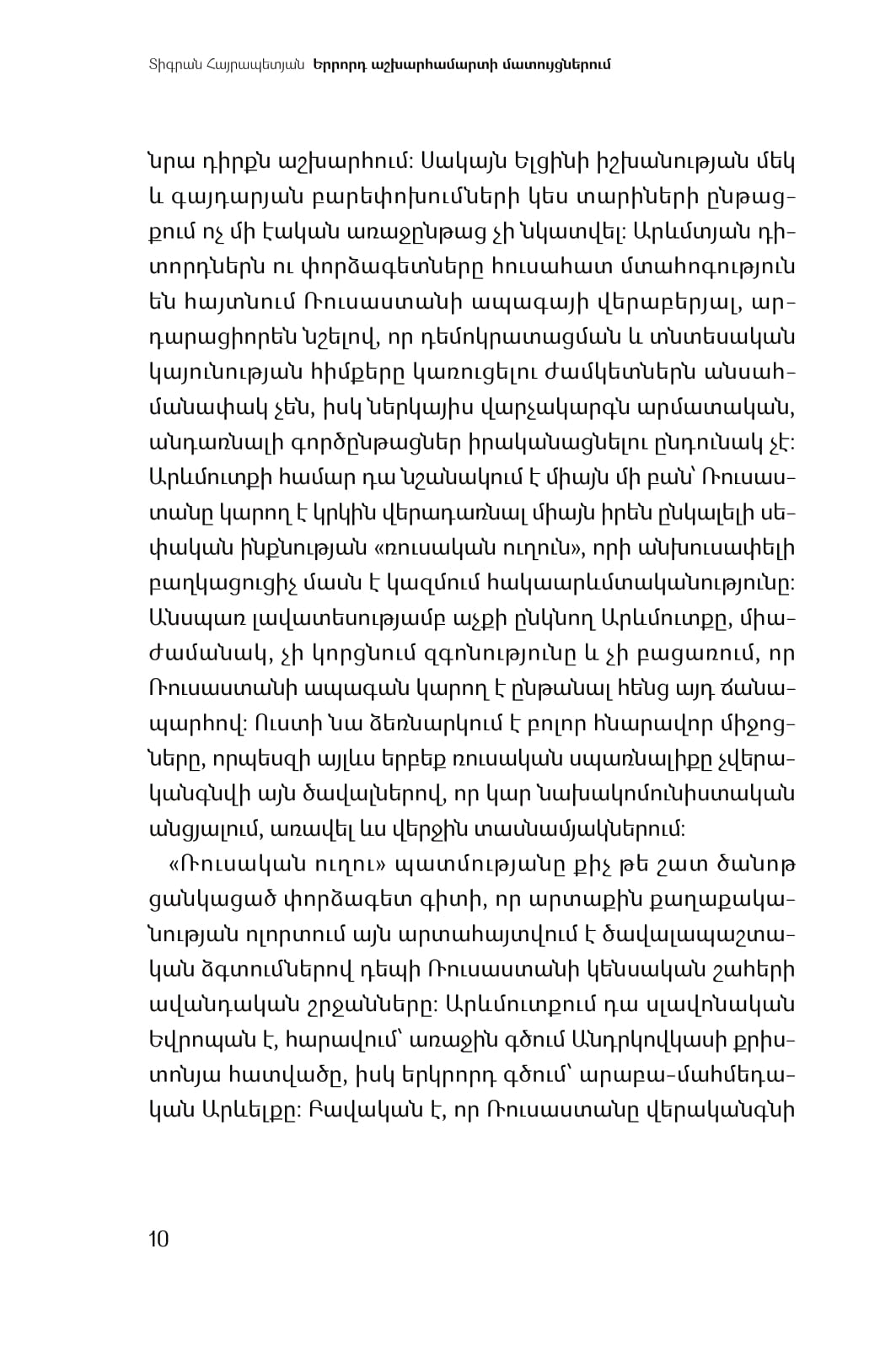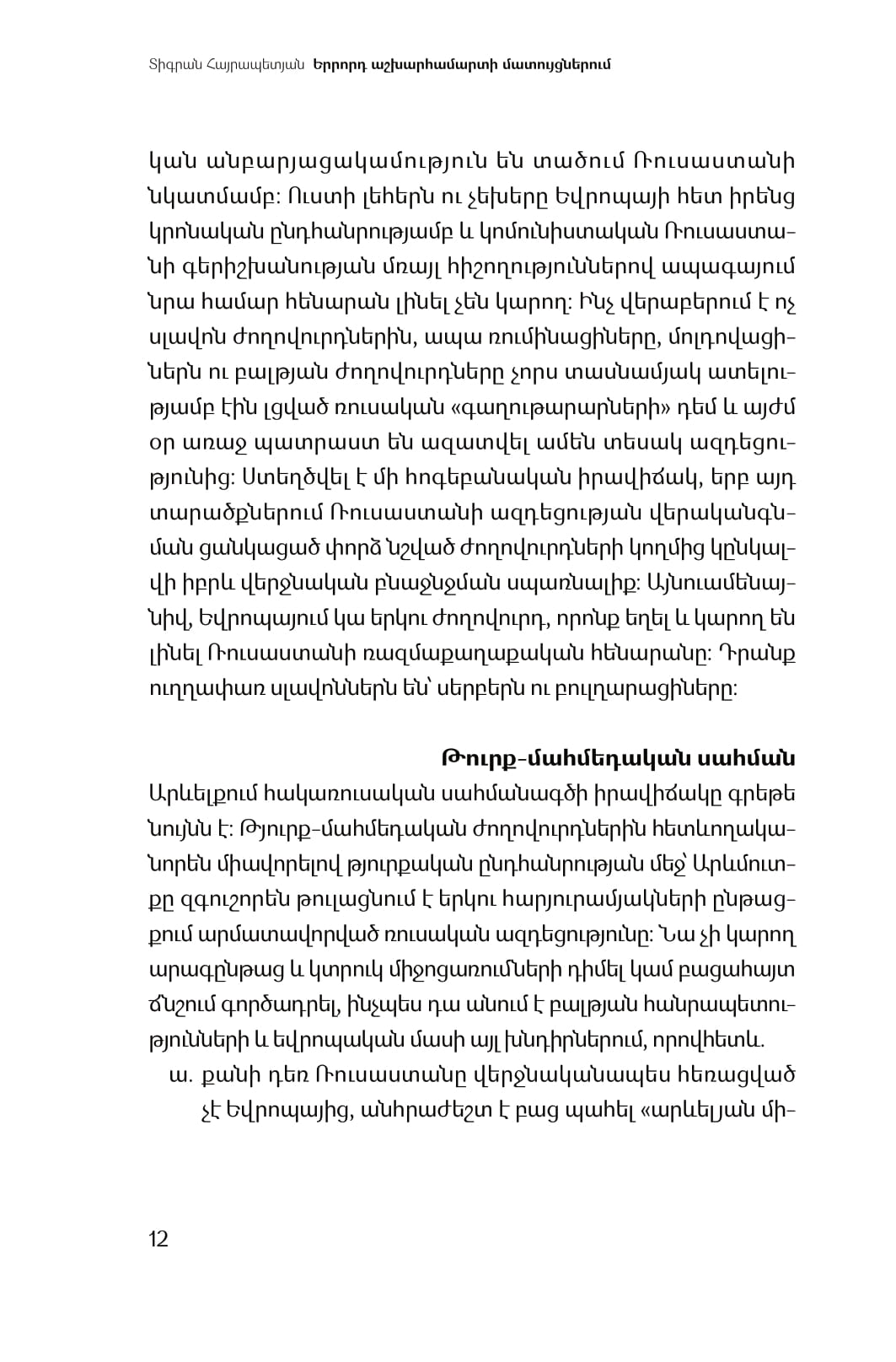 The ideological core of the 2nd volume of Tigran Hayrapetyan's works is the revolution of the world with the specter of a possible new, great war. Tigran wrote about Russia, the West and the Middle East which are the most important test for the Armenian state. In the 1st part called "Russian Rebellion or the Ghost of the Returning Empire", the political scientist analyzes Russia's past and present, predicts future realities: the new interstate union, the role of Armenia, expectations and global risks. In the 2nd part called "The Geopolitical Trap", the author reflects on the direction of the American political course since the collapse of the USSR, the end of European unity, the logic of inter-ethnic conflicts and the marked boundaries of the new world order, the borderline between war and peace.