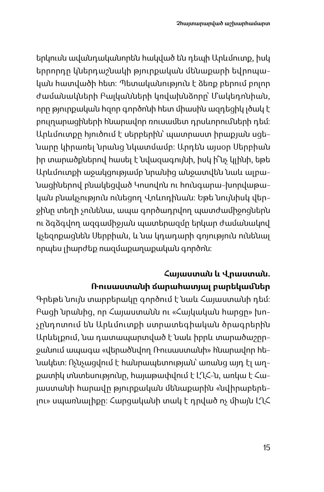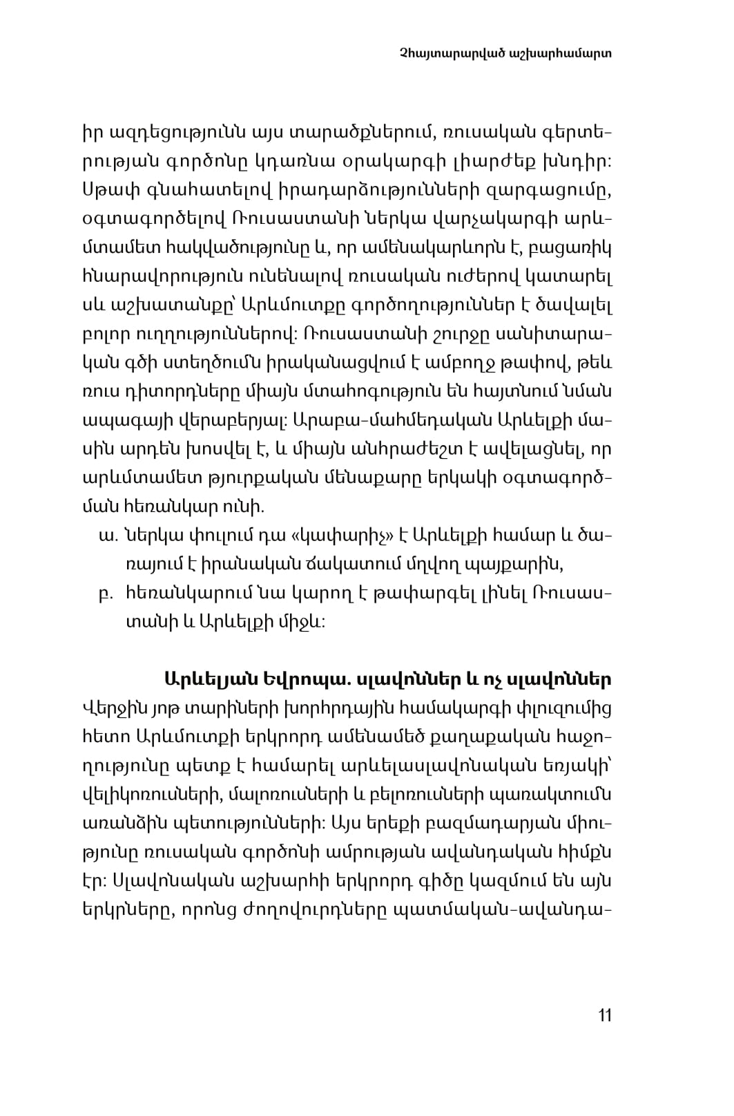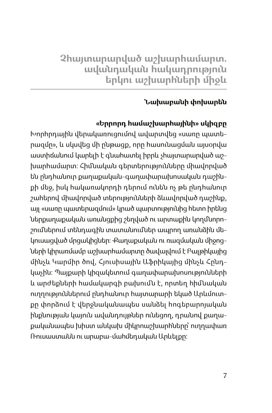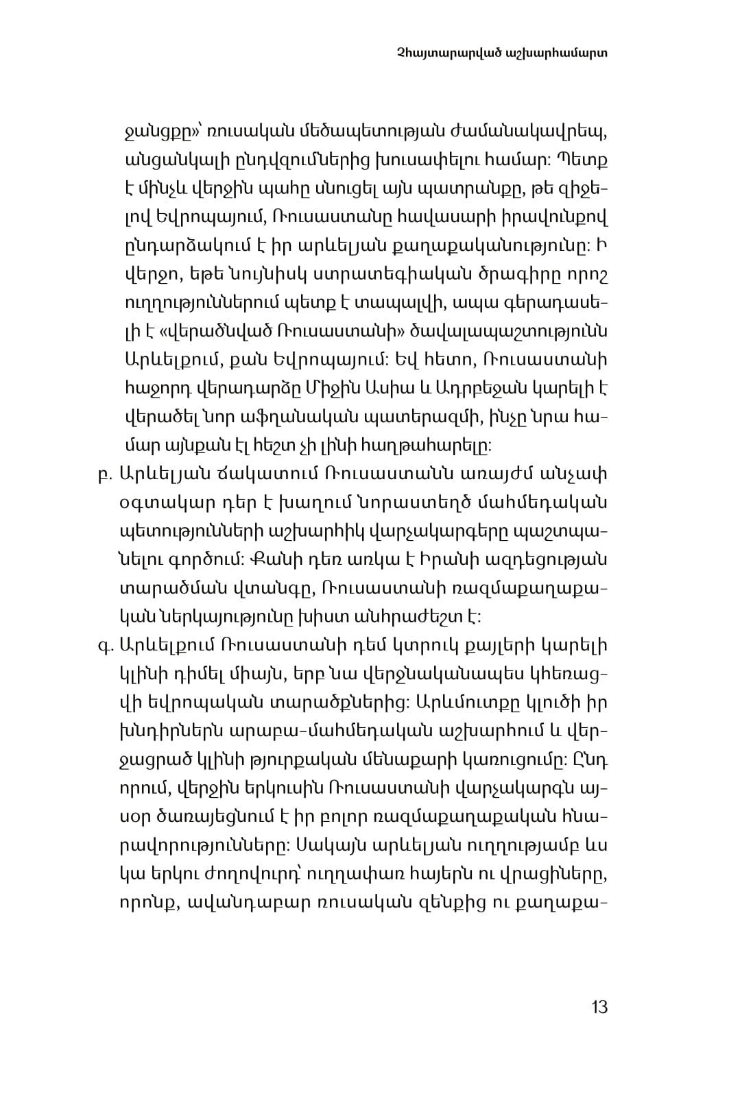 The ideological core of the 2nd volume of Tigran Hayrapetyan's works is the revolution of the world with the specter of a possible new, great war. Tigran wrote about Russia, the West and the Middle East which are the most important test for the Armenian state. In the 1st part called "Russian Rebellion or the Ghost of the Returning Empire", the political scientist analyzes Russia's past and present, predicts future realities: the new interstate union, the role of Armenia, expectations and global risks. In the 2nd part called "The Geopolitical Trap", the author reflects on the direction of the American political course since the collapse of the USSR, the end of European unity, the logic of inter-ethnic conflicts and the marked boundaries of the new world order, the borderline between war and peace.