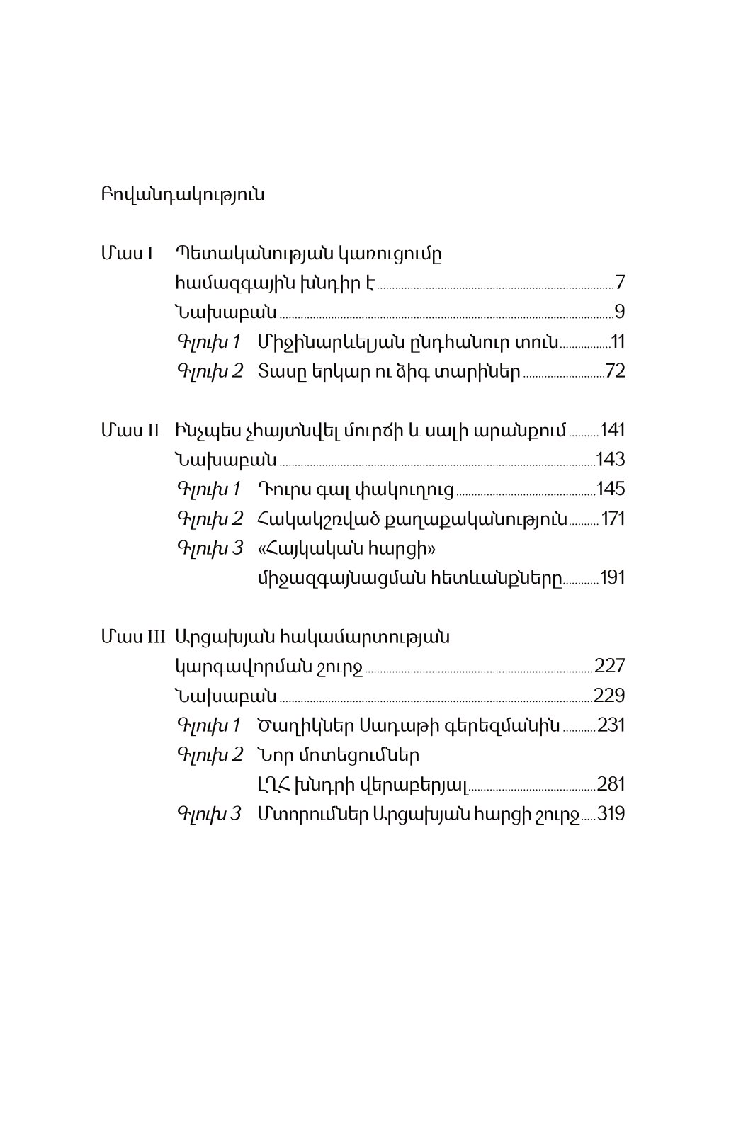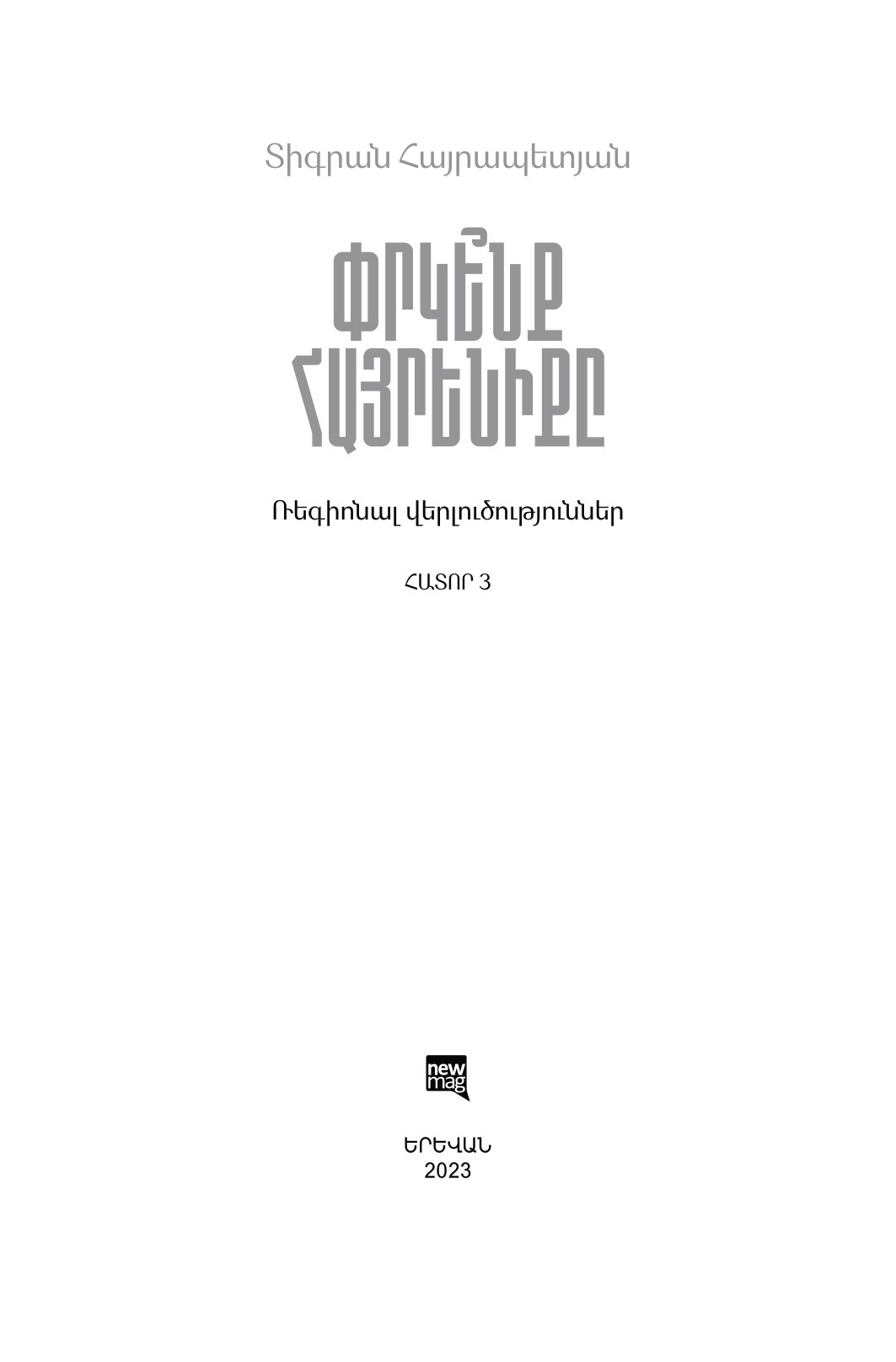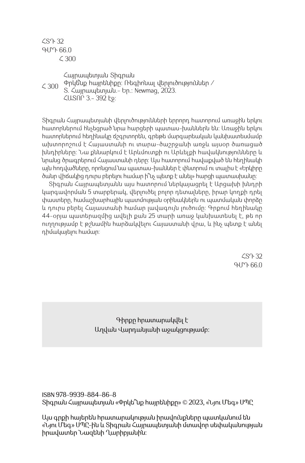 The third volume of Tigran Hayrapetyan's book contains the answers to his questions raised in the first two volumes. In the first two volumes, the author accurately, almost prophetically, diagnoses the problems facing Armenia and the region today. He discusses the ambitions of the West and the East and the role of Armenia in their plans. In this volume, the author's articles are collected, in which he seeks answers and gives the answer to the question "What should be done to get the country out of a difficult situation?" In this volume, Tigran Hayrapetyan presented 5 options for settling the Artsakh problem, analyzed all the details, juxtaposed the facts, examples of world history and historical experience, and came up with the best solution for Armenia. In the book, more than 25 years before the 44-day war, the author predicted in which direction the enemy would attack Armenia, and what should be done to resist.
