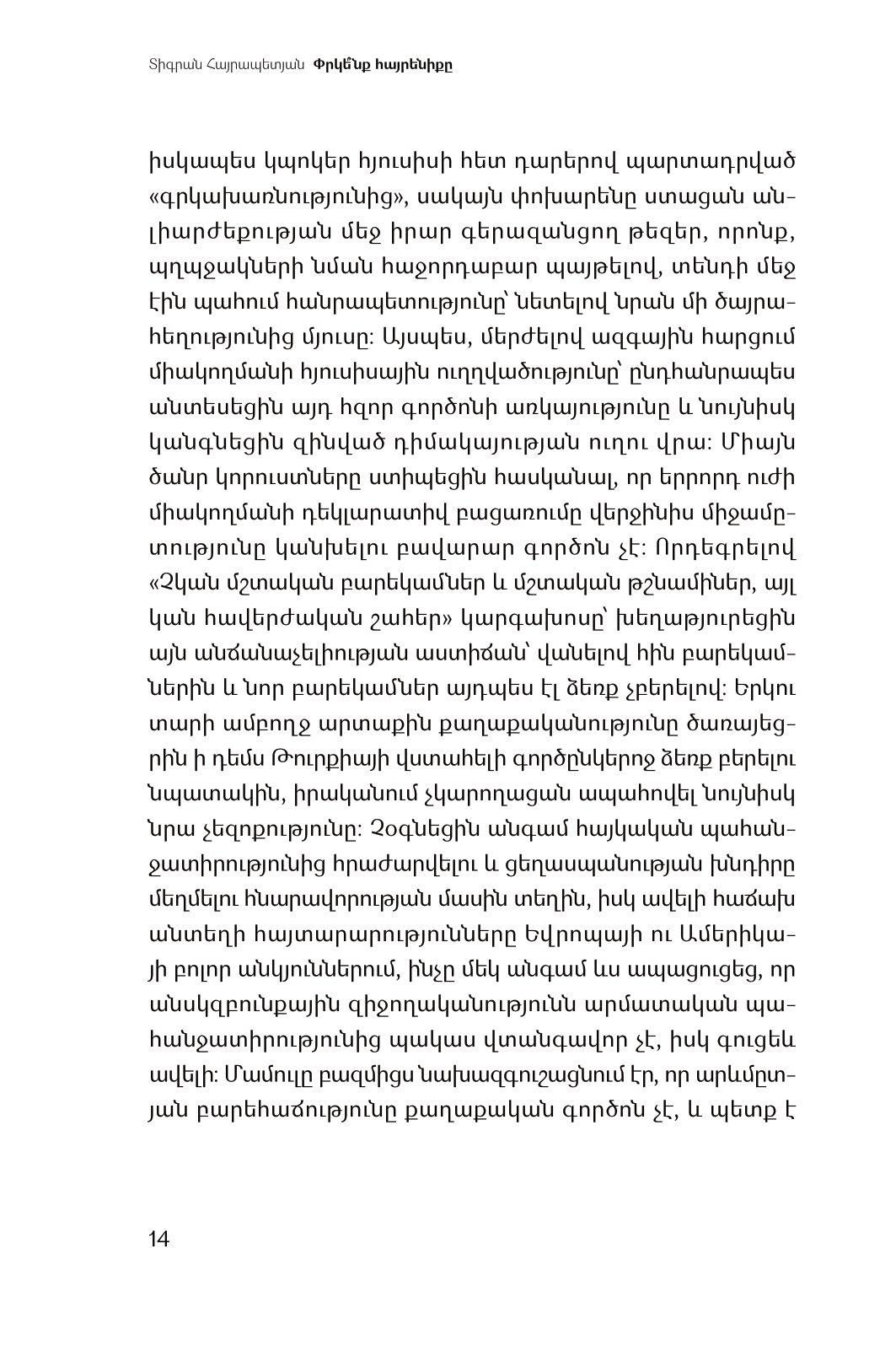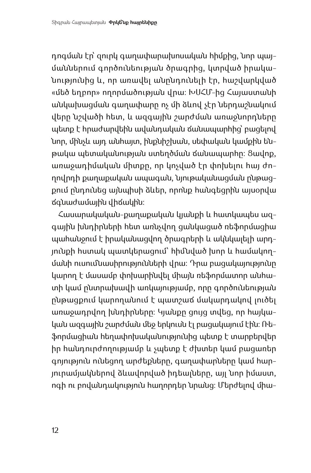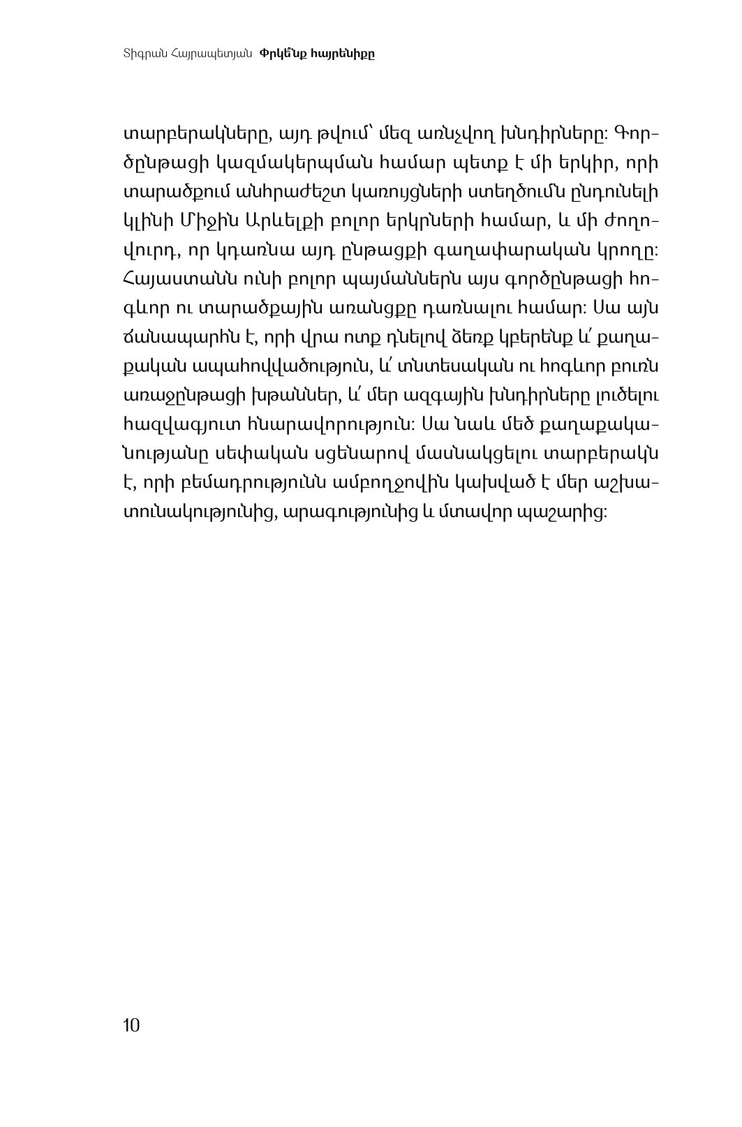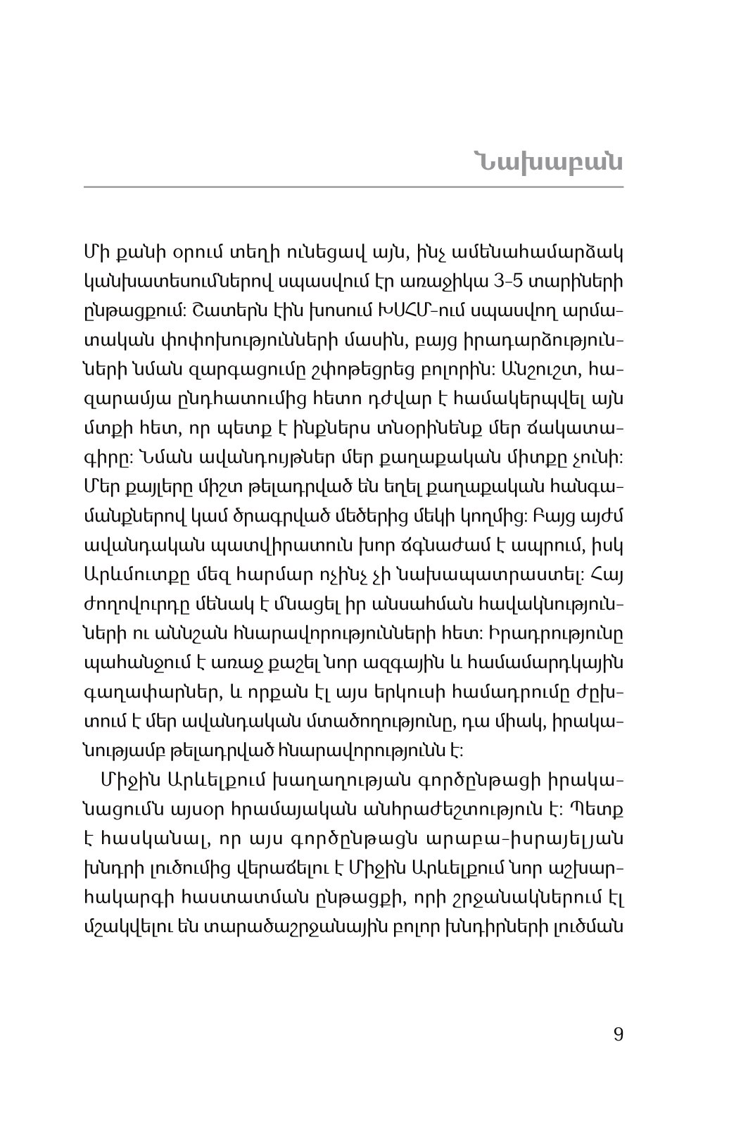 The third volume of Tigran Hayrapetyan's book contains the answers to his questions raised in the first two volumes. In the first two volumes, the author accurately, almost prophetically, diagnoses the problems facing Armenia and the region today. He discusses the ambitions of the West and the East and the role of Armenia in their plans. In this volume, the author's articles are collected, in which he seeks answers and gives the answer to the question "What should be done to get the country out of a difficult situation?" In this volume, Tigran Hayrapetyan presented 5 options for settling the Artsakh problem, analyzed all the details, juxtaposed the facts, examples of world history and historical experience, and came up with the best solution for Armenia. In the book, more than 25 years before the 44-day war, the author predicted in which direction the enemy would attack Armenia, and what should be done to resist.