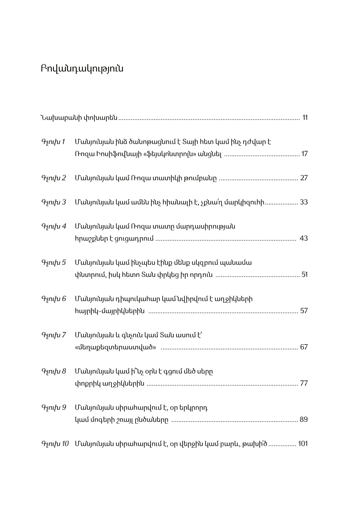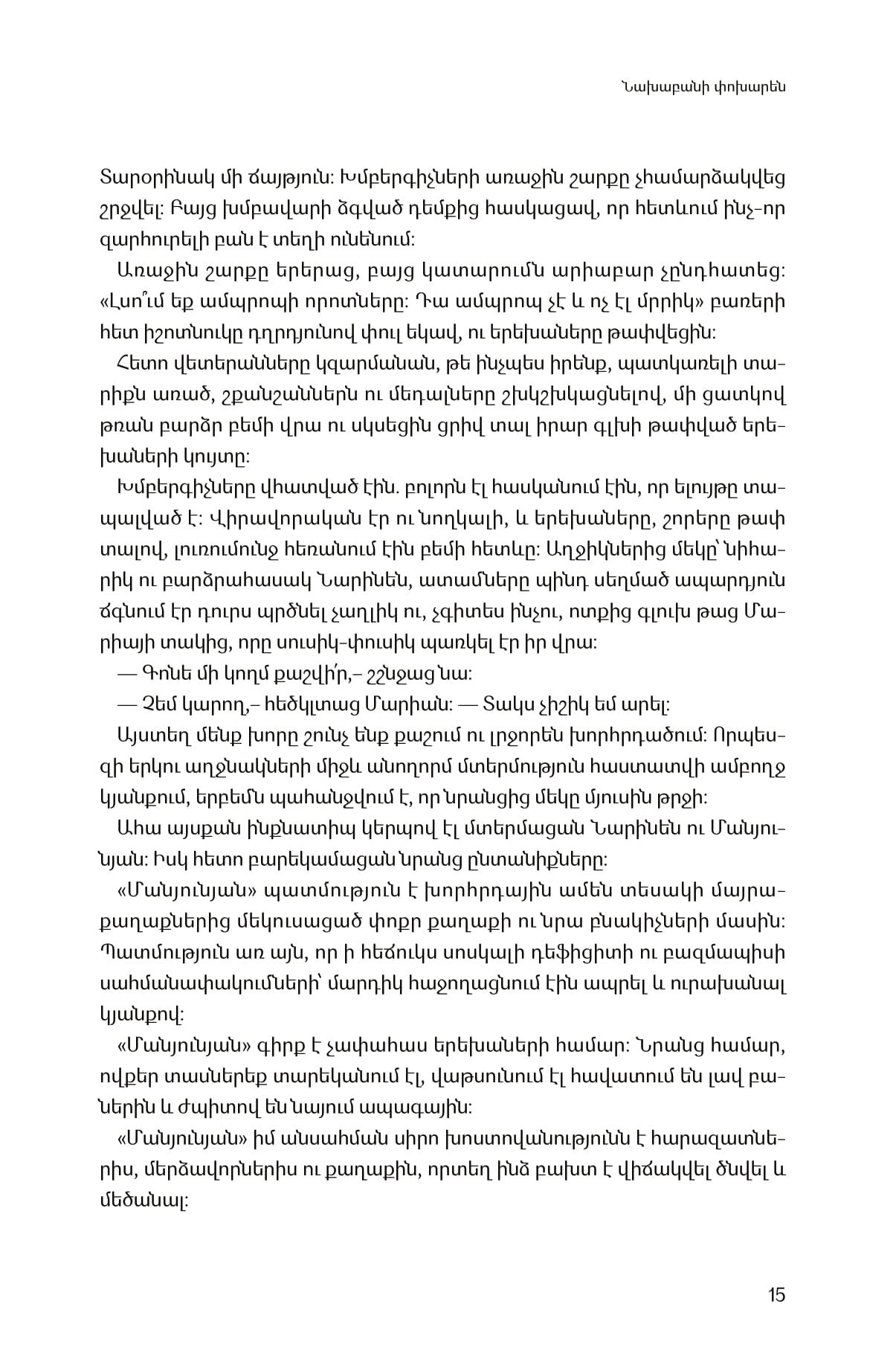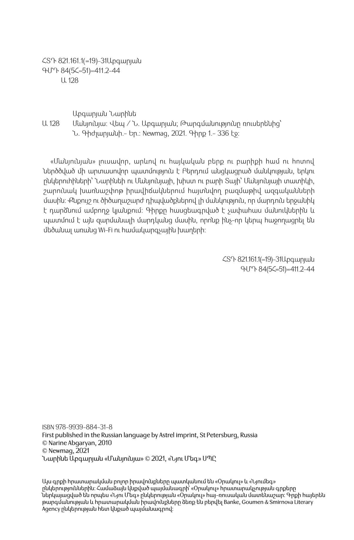 "Manyunya" is an unusual story about childhood in Berd, bright and full of sun and the smell of Armenian crops, about two friends: Narine and Manyunya, the strict and kind Ta who is Manyunya's grandmother, and many relatives who find themselves in constant trouble. A childhood full of tender and funny incidents that make a person happy all his life. The book tells the story of amazing people who somehow managed to grow up without Wi-Fi and computer games.