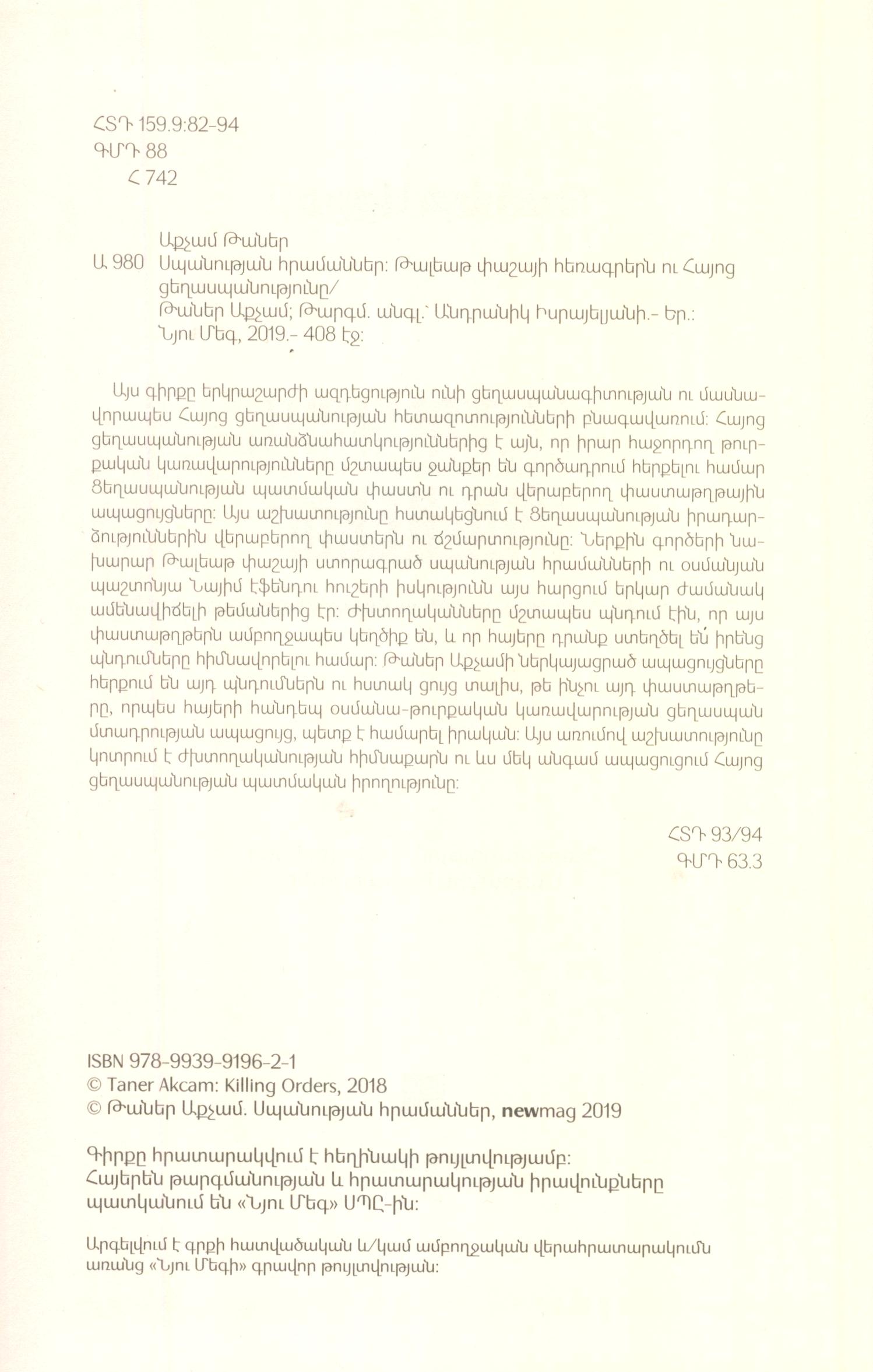 The book represents an earthquake in genocide studies, particularly in the field of Armenian Genocide research. A unique feature of the Armenian Genocide has been the long-standing efforts of successive Turkish governments to deny its historicity and to hide the documentary evidencesurrounding it. This book provides a major clarification of the often blurred lines between facts and truth in regard to these events. The authenticity of the killing orders signed by Ottoman Interior Minister Talat Pasha and the memoirs of the Ottoman bureaucrat Naim Efendi have been two of the most contested topics in this regard. The denialist school has long argued that these documents and memoirs were all forgeries, produced by Armenians to further their claims. Taner Akçam provides the evidence to refute the basis of these claims and demonstrates clearly why the documents can be trusted as authentic, revealing the genocidal intent of the Ottoman-Turkish government towards its Armenian population. As such, this work removes a cornerstone from the denialist edifice, and further establishes the historicity of the Armenian Genocide.