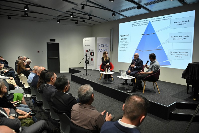 The book “The Hundred Years of Apartheid” was written on the occasion of the centennial of the Republic of Turkey. Akçam explores how the Turkish state was built on principles of ethnic cleansing and exclusion, with no space left for non-Muslims in public life. “Everyone in Turkey talks about democracy,” he said. “But why, after 100 years, has there not been a single Christian or Jewish official in high office?”